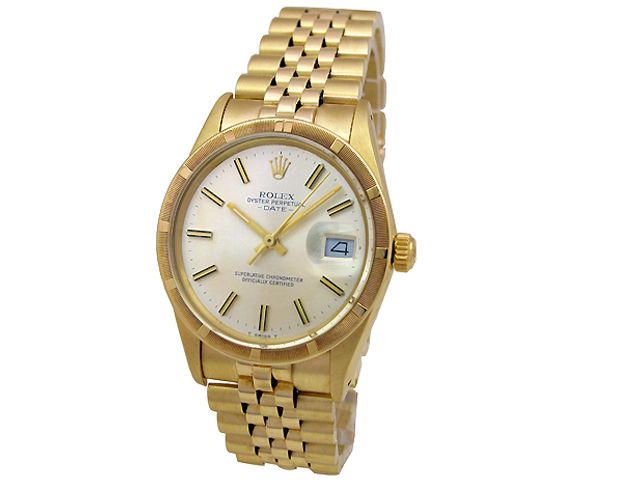 Rolex 14K Yellow Gold Oyster Perpetual Date Watch. **|**|** 34mm Rolex 14K Yellow Gold Oyster Perpetual Date Watch. Silver Roman Numeral Dial. 14k Yellow Gold Engine Turned Bezel. 14K Yellow Gold Jubilee Band. Style 15017. ; MSRP: $12900