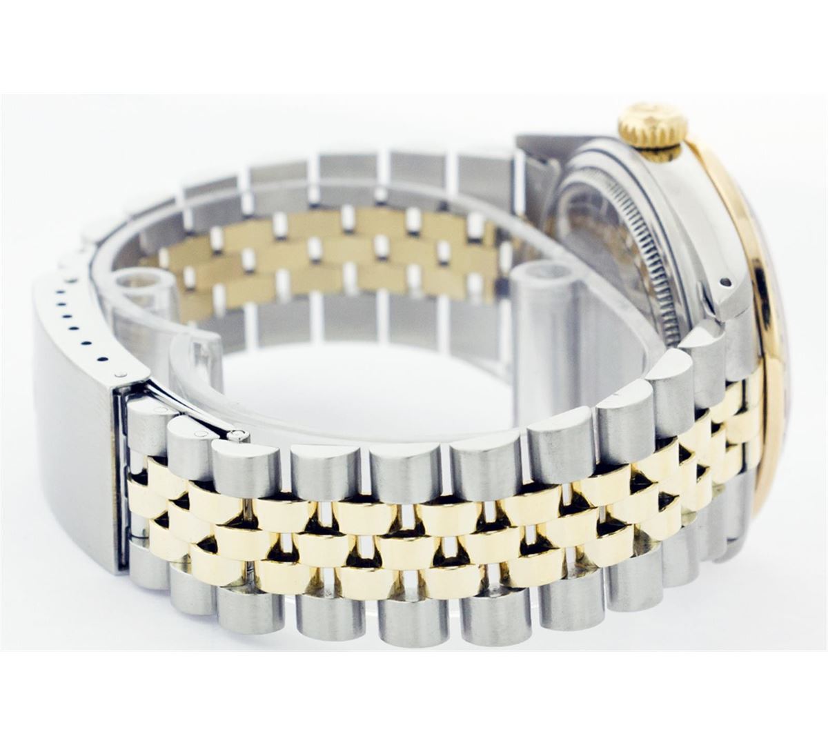 One Gents Two Tone Rolex Datejust Polished, Fully Serviced & Electronically Tested, 14K Yellow Gold & Stainless Steel Case:36mm, 14K Yellow Gold Crown, Custom Bezel: 18K Yellow Gold Beadset Diamond Bezel, Diamond Count: 44 Diamonds, Total Weight 1.0 Carat, Clarity: Si-VS, Color: G to H. Custom Crystal: Synthetic Sapphire Cyclops Lens. Movement: Automatic Winding Movement Caliber 3035. Custom Dial: Silver Diamond Dial With Square Track and Luminescent Dots. Diamond Count: 10 Diamonds In Dial, Color: G to H, Clarity: SI-VS. Date Window: 3 O'Clock Position Date Display, Quickset, Model: Datejust Condition: G-6 Extra Fine. Bracelet: Two Tone 14K Yellow Gold & Stainless Steel Jubilee. Bright Polish. 6.5 Inch Length, Adjustable. Standard Clasp, With Rolex Logo.