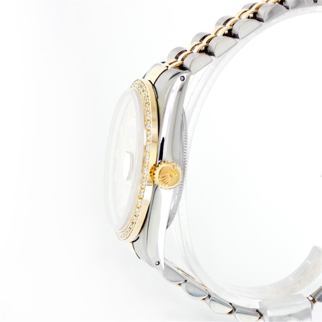 One Gents Two Tone Rolex Datejust Polished, Fully Serviced & Electronically Tested, 14K Yellow Gold & Stainless Steel Case:36mm, 14K Yellow Gold Crown, Custom Bezel: 18K Yellow Gold Beadset Diamond Bezel, Diamond Count: 44 Diamonds, Total Weight 1.0 Carat, Clarity: Si-VS, Color: G to H. Custom Crystal: Synthetic Sapphire Cyclops Lens. Movement: Automatic Winding Movement Caliber 3035. Custom Dial: Silver Diamond Dial, Diamond Count: 10 Diamonds In Dial, Clarity: SI-VS, Color: G to H. Date Window: 3 O'Clock Position Date Display, Quickset, Model: Datejust Condition: G-6 Extra Fine. Bracelet: Two Tone 14K Yellow Gold & Stainless Steel Jubilee. Bright Polish. 6.5 Inch Length, Adjustable. Standard Clasp, With Rolex Logo.