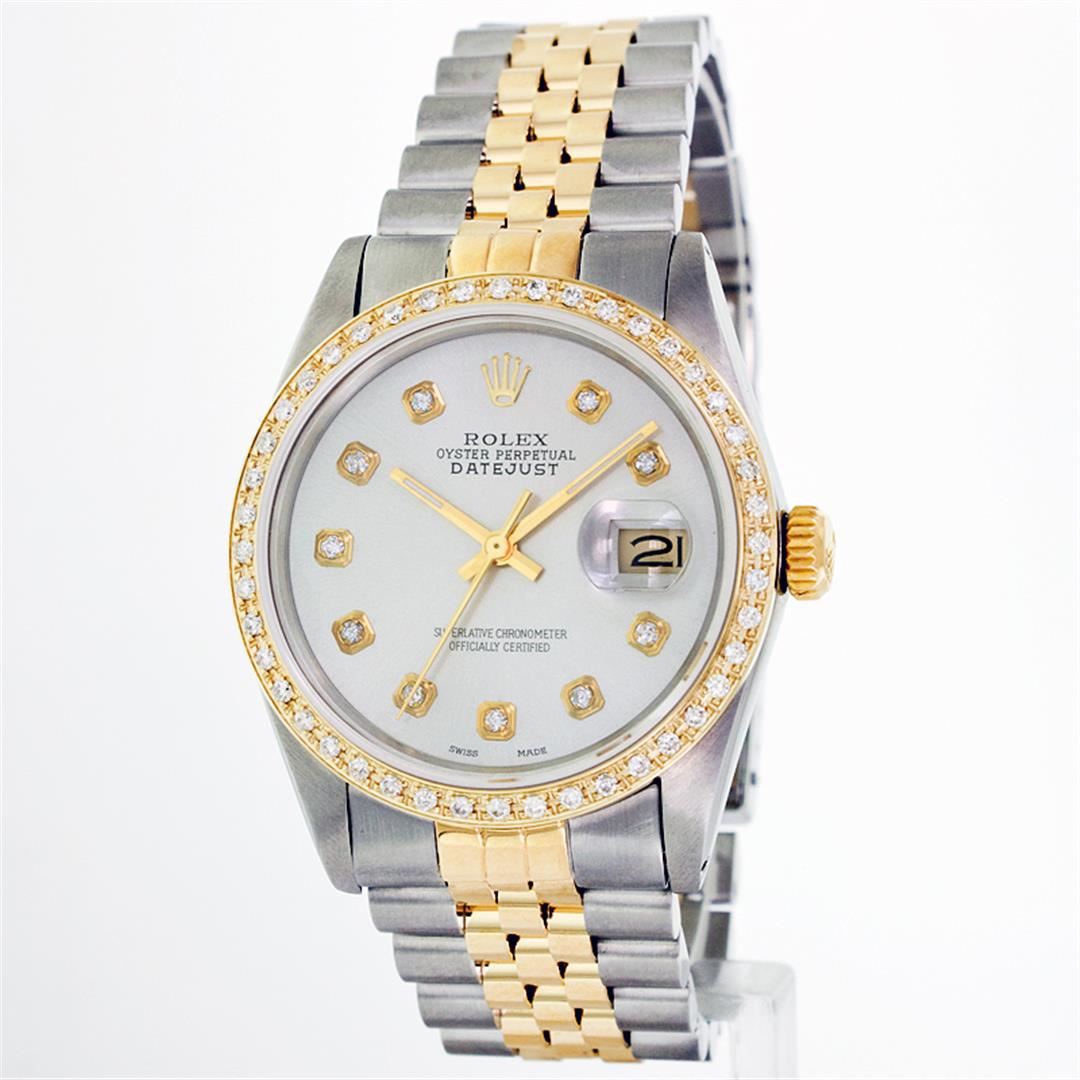 One Gents Two Tone Rolex Datejust Polished, Fully Serviced & Electronically Tested, 14K Yellow Gold & Stainless Steel Case:36mm, 14K Yellow Gold Crown, Custom Bezel: 18K Yellow Gold Beadset Diamond Bezel, Diamond Count: 44 Diamonds, Total Weight 1.0 Carat, Clarity: Si-VS, Color: G to H. Custom Crystal: Synthetic Sapphire Cyclops Lens. Movement: Automatic Winding Movement Caliber 3035. Custom Dial: Silver Diamond Dial, Diamond Count: 10 Diamonds In Dial, Clarity: SI-VS, Color: G to H. Date Window: 3 O'Clock Position Date Display, Quickset, Model: Datejust Condition: G-6 Extra Fine. Bracelet: Two Tone 14K Yellow Gold & Stainless Steel Jubilee. Bright Polish. 6.5 Inch Length, Adjustable. Standard Clasp, With Rolex Logo. Comes with a six month warranty card.