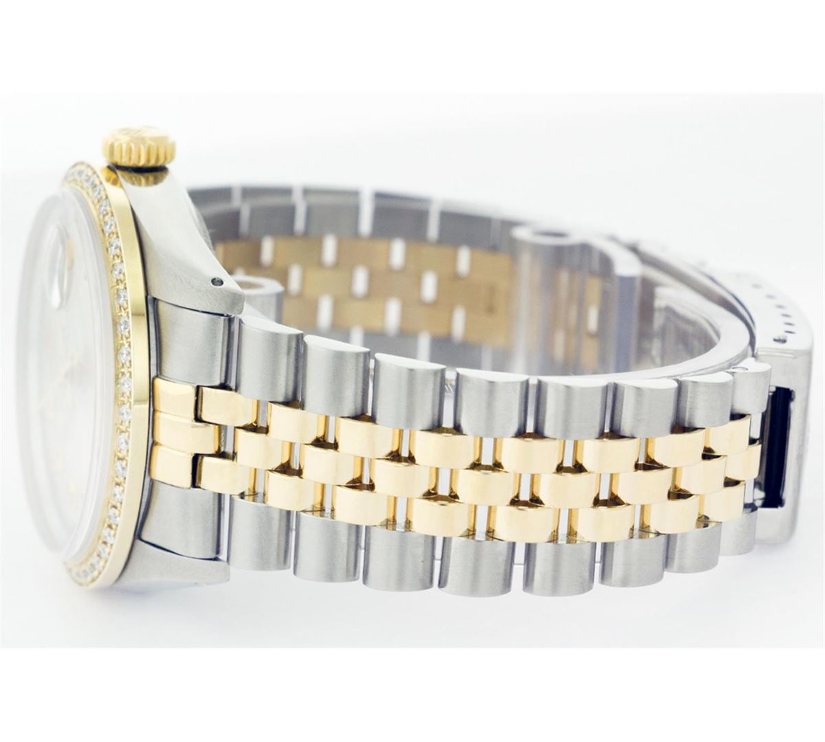 One Gents Two Tone Rolex Datejust Polished, Fully Serviced & Electronically Tested, 14K Yellow Gold & Stainless Steel Case:36mm, 14K Yellow Gold Crown, Custom Bezel: 18K Yellow Gold Beadset Diamond Bezel, Diamond Count: 44 Diamonds, Total Weight 1.0 Carat, Clarity: Si-VS, Color: G to H. Custom Crystal: Synthetic Sapphire Cyclops Lens. Movement: Automatic Winding Movement Caliber 3035. Custom Dial: Silver Diamond Dial With Square Track and Luminescent Dots. Diamond Count: 10 Diamonds In Dial, Color: G to H, Clarity: SI-VS. Date Window: 3 O'Clock Position Date Display, Quickset, Model: Datejust Condition: G-6 Extra Fine. Bracelet: Two Tone 14K Yellow Gold & Stainless Steel Jubilee. Bright Polish. 6.5 Inch Length, Adjustable. Standard Clasp, With Rolex Logo.