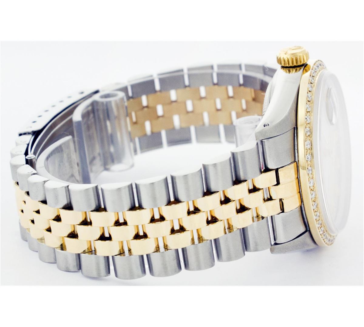 One Gents Two Tone Rolex Datejust Polished, Fully Serviced & Electronically Tested, 14K Yellow Gold & Stainless Steel Case:36mm, 14K Yellow Gold Crown, Custom Bezel: 18K Yellow Gold Beadset Diamond Bezel, Diamond Count: 44 Diamonds, Total Weight 1.0 Carat, Clarity: Si-VS, Color: G to H. Custom Crystal: Synthetic Sapphire Cyclops Lens. Movement: Automatic Winding Movement Caliber 3035. Custom Dial: Champagne Roman Dial With Square Track. Date Window: 3 O'Clock Position Date Display, Quickset, Model: Datejust Condition: G-6 Extra Fine. Bracelet: Two Tone 14K Yellow Gold & Stainless Steel Jubilee. Bright Polish. 6.5 Inch Length, Adjustable. Standard Clasp, With Rolex Logo.