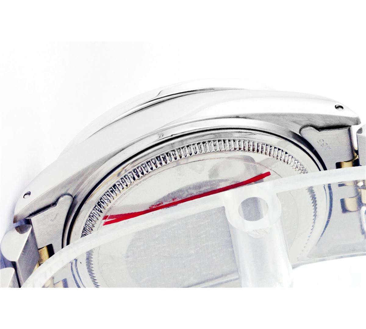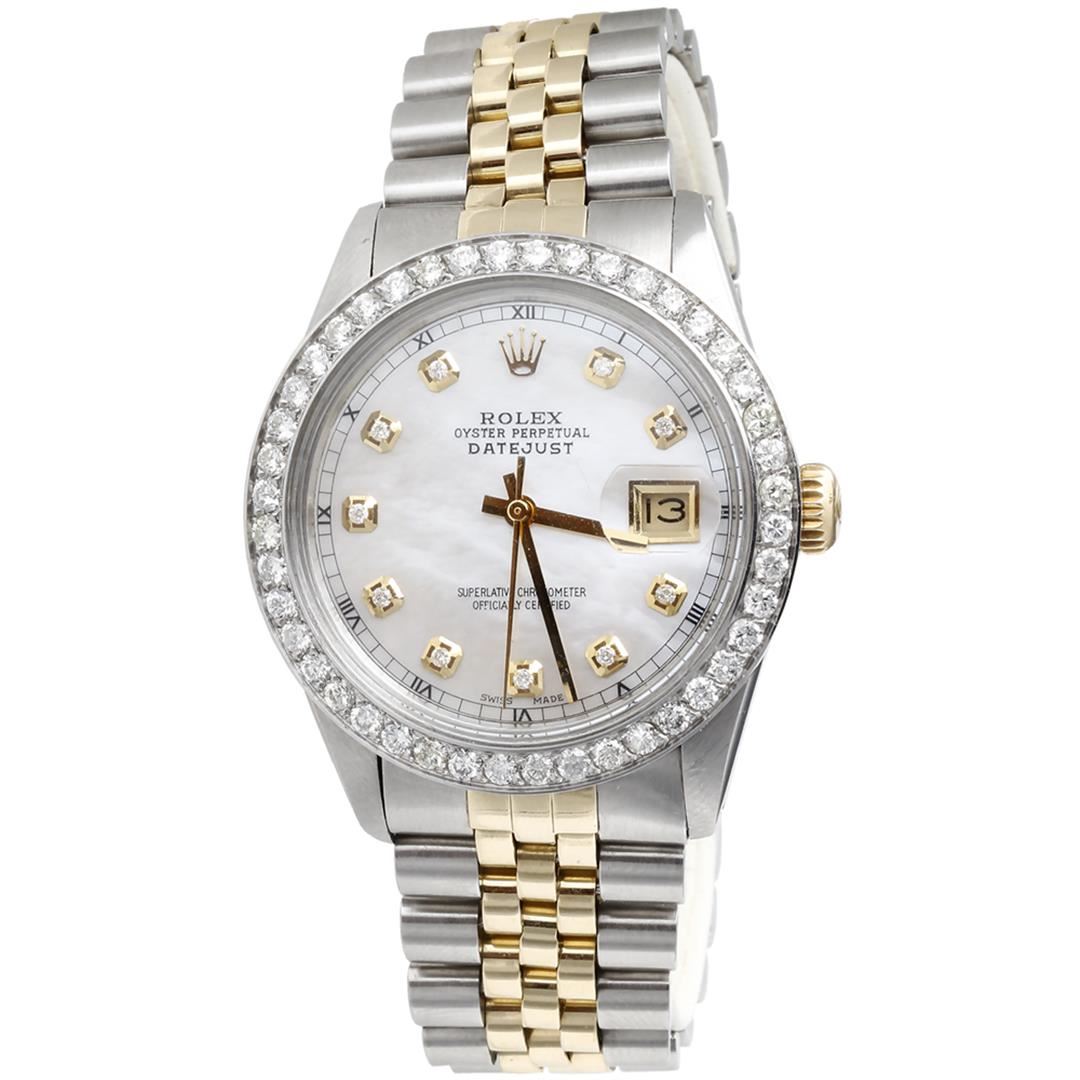One Gents Two Tone Rolex Datejust Polished, Fully Serviced & Electronically Tested, 14K Yellow Gold & Stainless Steel Case:36mm, 14K Yellow Gold Crown, Custom Bezel: Stainless Steel Diamond Bezel, Diamond Count: 44 Diamonds, Total Weight 2.00 Carat, Clarity: SI-VS, Color: G to H. Custom Crystal: Synthetic Sapphire Cyclops Lens. Movement: Automatic Winding Movement Caliber 3035. Custom Dial: Mother Of Pearl Diamond Dial With Square Roman Track, Diamond Count: 10 Diamonds In Dial, Color: G to H, Clarity: SI -VS. Date Window: 3 O'clock Position Date Display, Quickset, Model: Datejust Condition: G-6 Extra Fine. Bracelet: Two Tone 14K Yellow Gold & Stainless Steel Jubilee. Bright Polish. 6.5 Inch Length, Adjustable. Standard Clasp, With Rolex Logo.