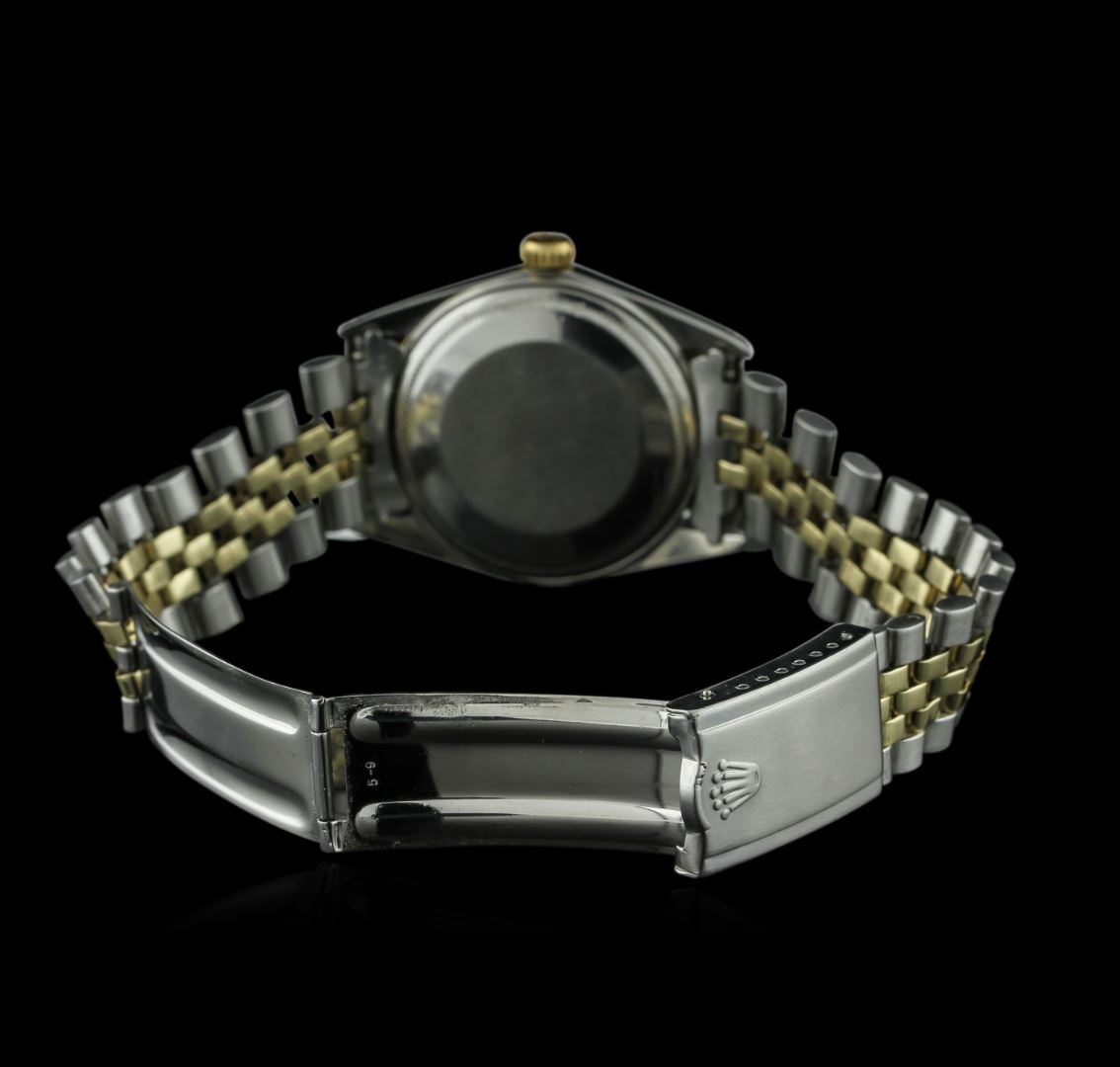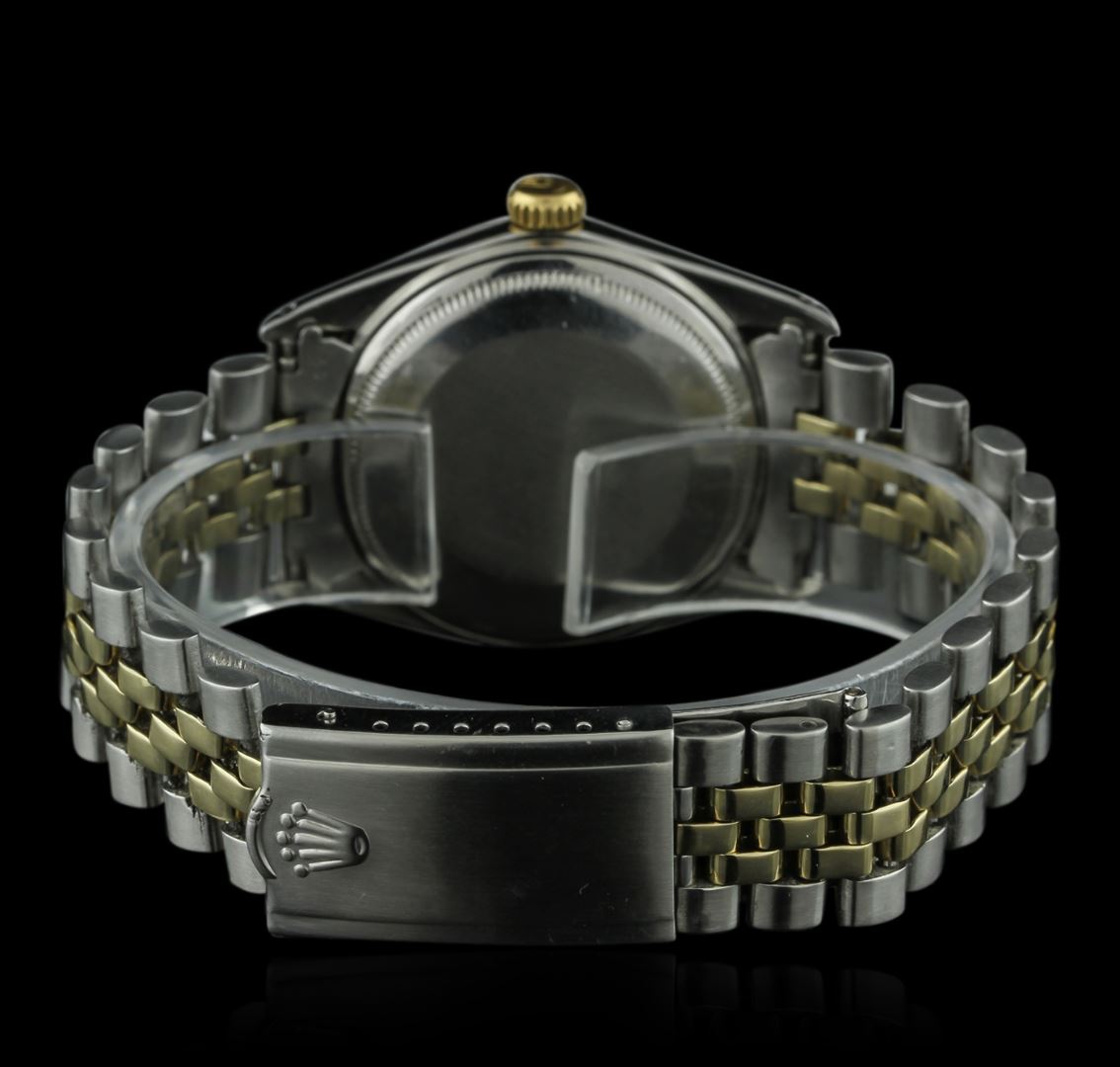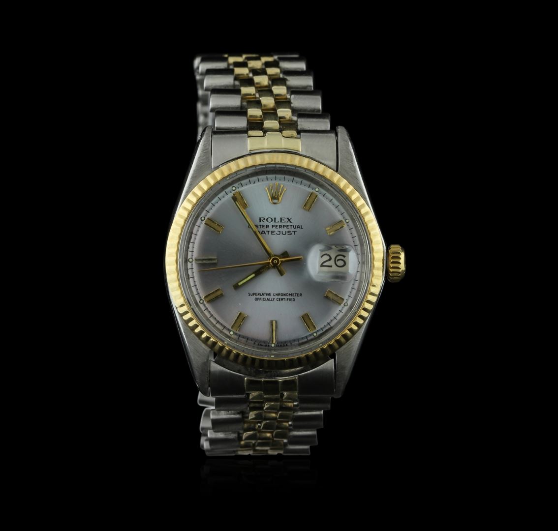 One gents, hand crafted & machine milled Rolex two-tone DateJust model wristwatch electronically tested, Case: 36mm oyster, Custom Crystal: acrylic cyclops lens, 14KT yellow gold Crown: twinlock with logo, Bezel: 14KT yellow gold fluted, Movement: superlative chronometer. Dial: Dark Silver, with baton hands & indices, Date Window: 3 o'clock position non-quick set, Bracelet: two-tone stainless steel & 14KT yellow gold jubilee, Condition: G-4 Average. Seven inch length, adjustable. Standard clasp, with logo. Total Weight of Watch 86.45gm. Model number and serial number have worn off over time. AIG Appraised at $5,550.00.