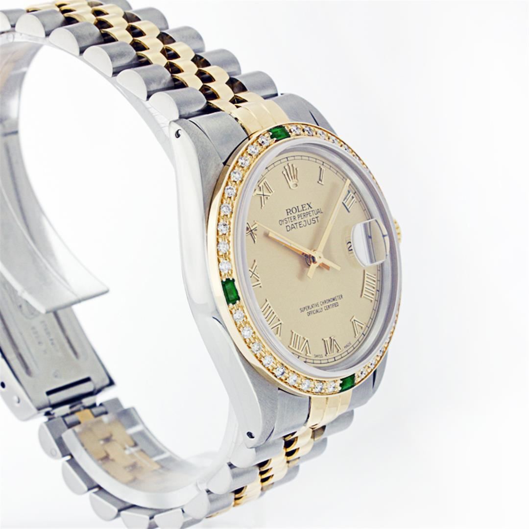 One Gents Two Tone Rolex Datejust Polished, Fully Serviced & Electronically Tested, 14K Yellow Gold & Stainless Steel Case:36mm, 14K Yellow Gold Crown, Custom Bezel: 18K Yellow Gold Emerald Beadset Diamond Bezel, Diamond Count: 36 Diamonds + 4 Emeralds, Total Weight 1.0 Carat, Clarity: Si-VS, Color: G to H. Custom Crystal: Synthetic Sapphire Cyclops Lens. Movement: Automatic Winding Movement Caliber 3035. Custom Dial: Champagne Roman Dial With Square Track. Date Window: 3 O'Clock Position Date Display, Quickset, Model: Datejust Condition: G-6 Extra Fine. Bracelet: Two Tone 14K Yellow Gold & Stainless Steel Jubilee. Bright Polish. 6.5 Inch Length, Adjustable. Standard Clasp, With Rolex Logo.