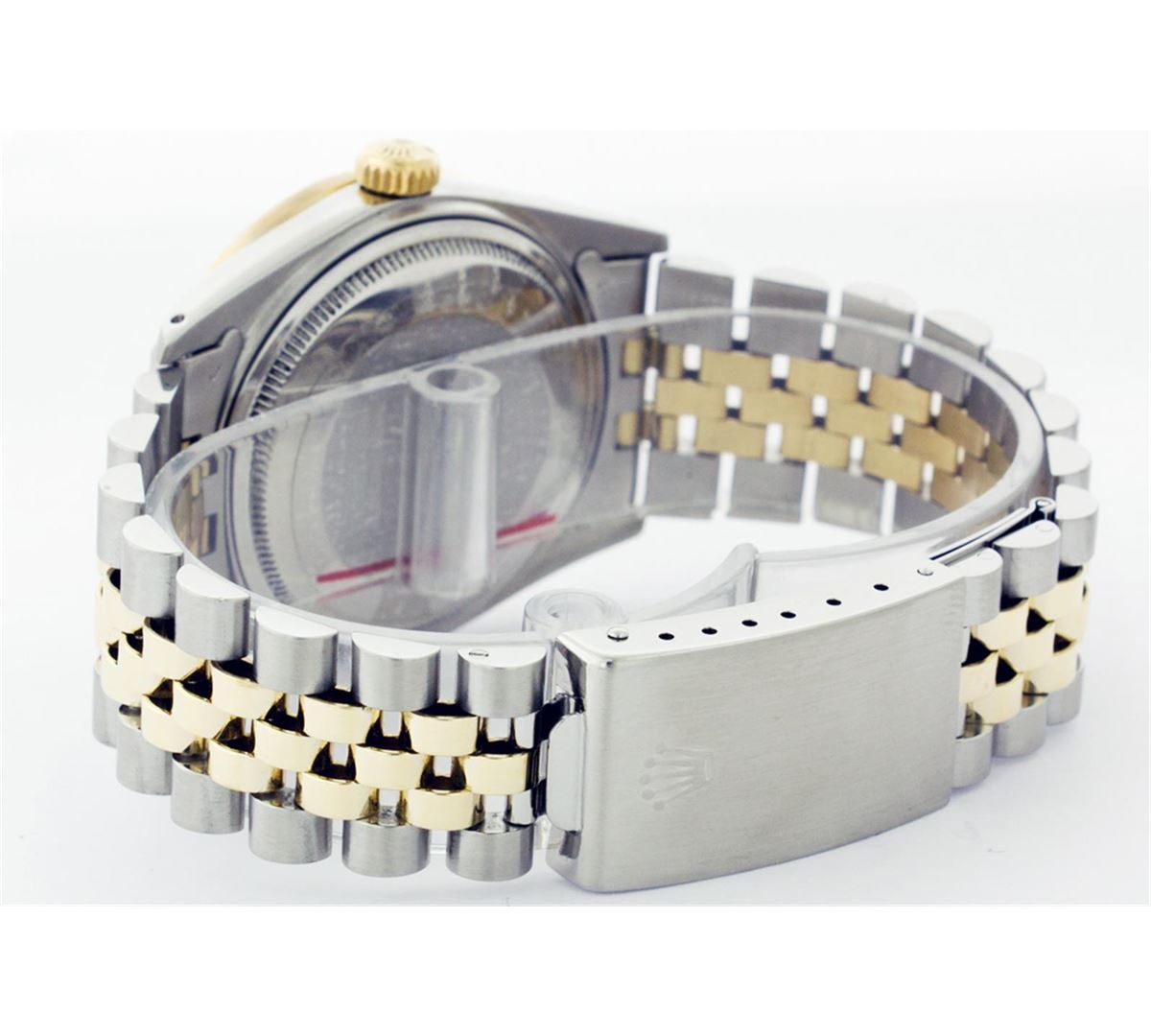 One Gents Two Tone Rolex Datejust Polished, Fully Serviced & Electronically Tested, 14K Yellow Gold & Stainless Steel Case:36mm, 14K Yellow Gold Crown, Custom Bezel: 18K Yellow Gold Ruby Beadset Diamond Bezel, Diamond Count: 36 Diamonds + 4 Rubies, Total Weight 1.0 Carat, Clarity: Si-VS, Color: G to H. Custom Crystal: Synthetic Sapphire Cyclops Lens. Movement: Automatic Winding Movement Caliber 3035. Custom Dial: Champagne Roman Dial With Square Track. Date Window: 3 O'Clock Position Date Display, Quickset, Model: Datejust Condition: G-6 Extra Fine. Bracelet: Two Tone 14K Yellow Gold & Stainless Steel Jubilee. Bright Polish. 6.5 Inch Length, Adjustable. Standard Clasp, With Rolex Logo.