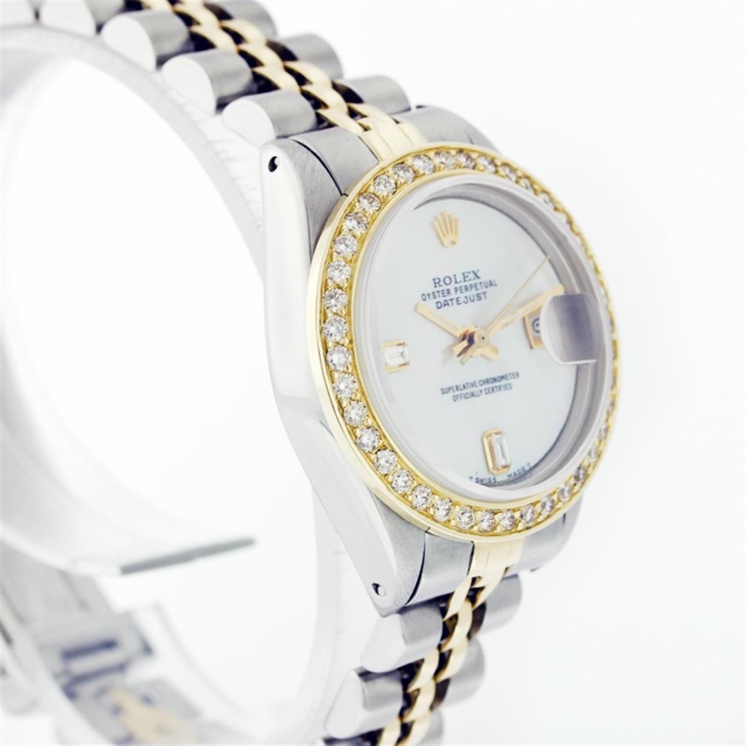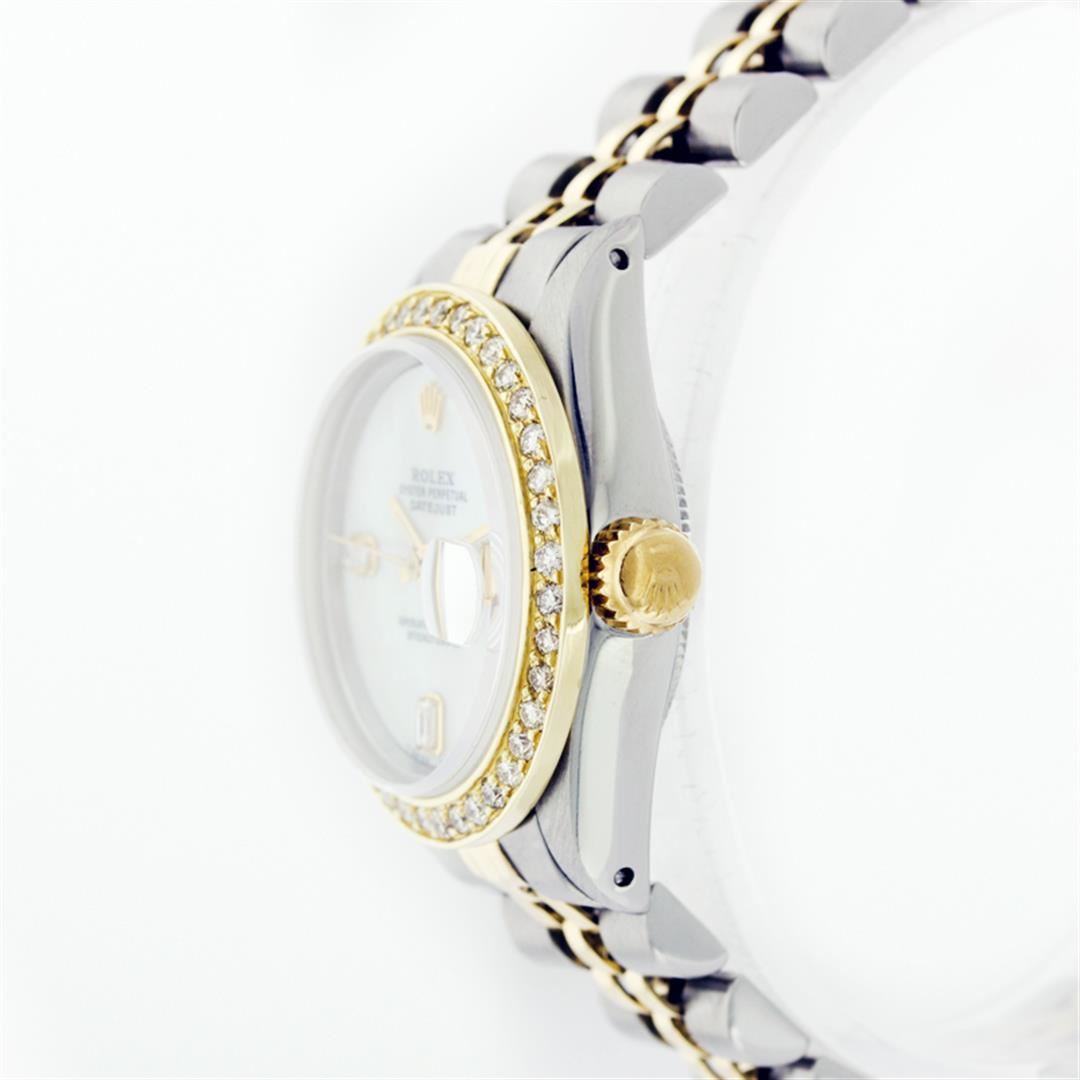 One Ladies Two Tone Rolex Datejust Polished, Serviced & Electronically Tested, 14K Yellow Gold & Stainless Steel Case:26mm, 14K Yellow Gold Crown, Custom Bezel: 18K Yellow Gold Beadset Diamond Bezel, Diamond Count: 32 Diamonds, Total Weight .70 Carat, Clarity: Si-VS, Color: G to H. Custom Crystal: Synthetic Sapphire Cyclops Lens. Movement: Automatic Winding Movement Caliber 2030. Custom Dial: Mother Of Pearl With Baguette Diamonds, Stone Count: 2 Baguette Diamonds in Dial. Date Window: 3 O'Clock Position Date Display, Non Quickset, Model: Datejust, Condition: G-6 Extra Fine. Bracelet: Two Tone 14K Yellow Gold & Stainless Steel Jubilee. Bright Polish. 5.5 Inch Length, Adjustable. Standard Clasp, With Rolex Logo.