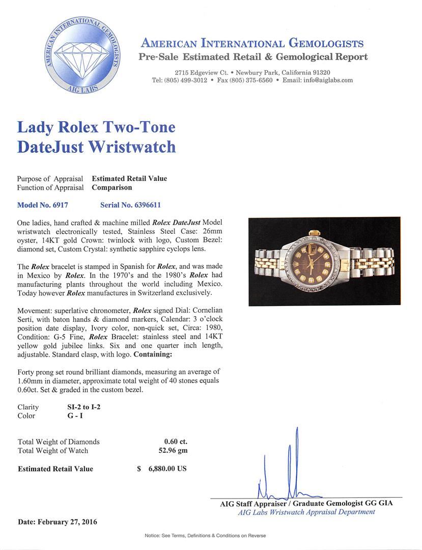 One ladies, hand crafted & machine milled Rolex DateJust Model wristwatch electronically tested, Stainless Steel Case: 26mm oyster, 14KT gold Crown: twinlock with logo, Custom Bezel: diamond set, Custom Crystal: synthetic sapphire cyclops lens. The Rolex bracelet is stamped in Spanish for Rolex, and was made in Mexico by Rolex. In the 1970's and the 1980's Rolex had manufacturing plants throughout the world including Mexico. Today however Rolex manufactures in Switzerland exclusively. Movement: superlative chronometer, Rolex signed Dial: Cornelian Serti, with baton hands & diamond markers, Calendar: 3 o'clock position date display, Ivory color, non-quick set, Circa: 1980, Condition: G-5 Fine, Rolex Bracelet: stainless steel and 14KT yellow gold jubilee links. Six and one quarter inch length, adjustable. Standard clasp, with logo. Containing: Forty prong set round brilliant diamonds, measuring an average of 1.60mm in diameter, approximate total weight of 40 stones equals 0.60ct. Set & graded in the custom bezel. Clarity: SI-2 to I-2. Color: G - I. Total Weight of Diamonds 0.60ct. Total Weight of Watch 52.96gm. AIG Appraised at $6,880.00.