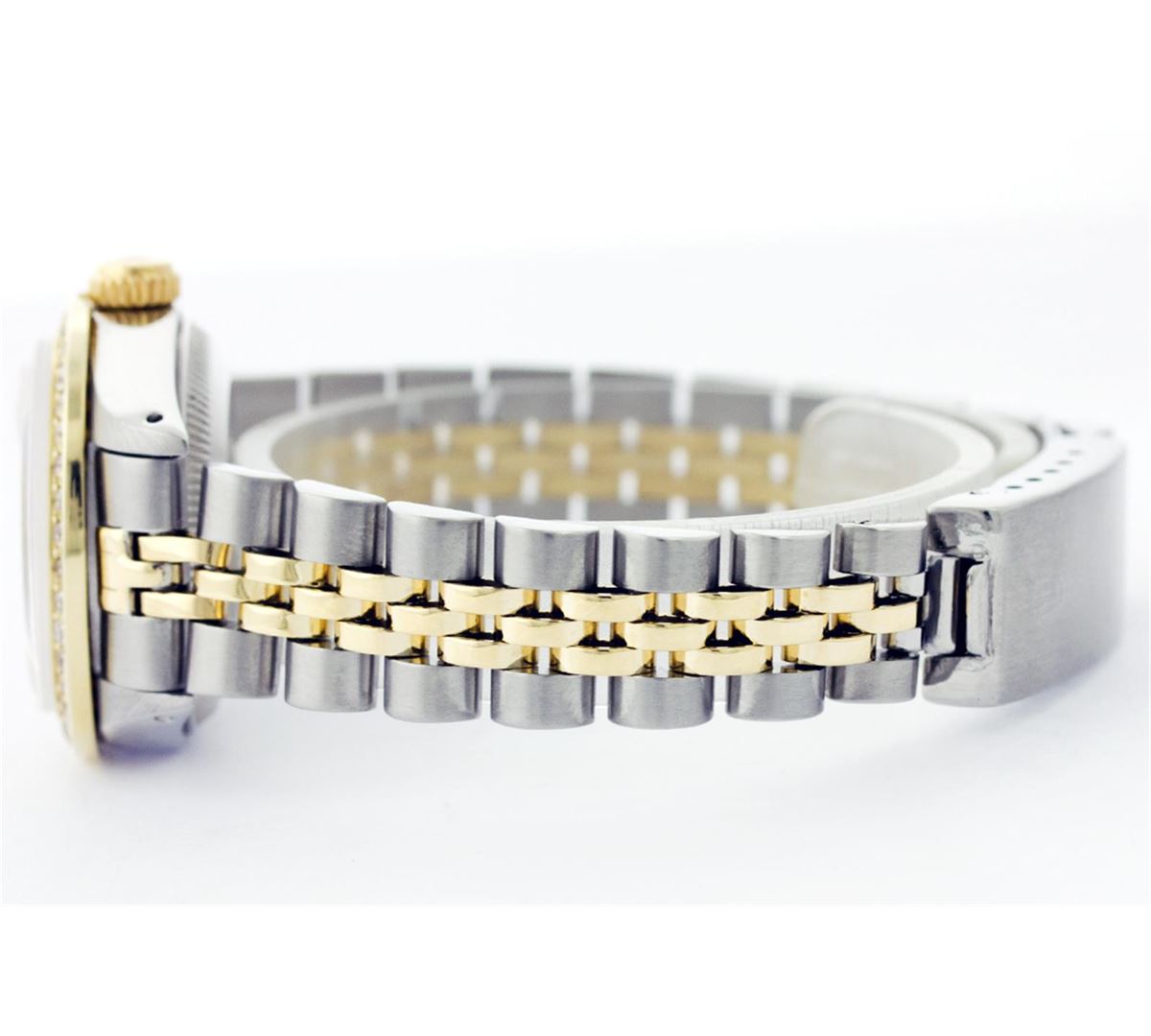 One Ladies Two Tone Rolex Datejust Polished, Serviced & Electronically Tested, 14K Yellow Gold & Stainless Steel Case:26mm, 14K Yellow Gold Crown, Custom Bezel: 18K Yellow Gold Beadset Diamond Bezel, Diamond Count: 32 Diamonds, Total Weight .70 Carat, Clarity: Si-VS, Color: G to H. Custom Crystal: Synthetic Sapphire Cyclops Lens. Movement: Automatic Winding Movement Caliber 2030. Custom Dial: Mother Of Pearl With Baguette Diamonds, Stone Count: 2 Baguette Diamonds in Dial. Date Window: 3 O'Clock Position Date Display, Non Quickset, Model: Datejust, Condition: G-6 Extra Fine. Bracelet: Two Tone 14K Yellow Gold & Stainless Steel Jubilee. Bright Polish. 5.5 Inch Length, Adjustable. Standard Clasp, With Rolex Logo.