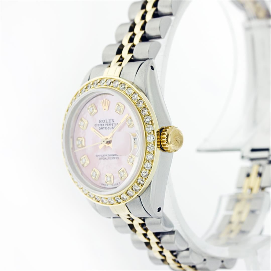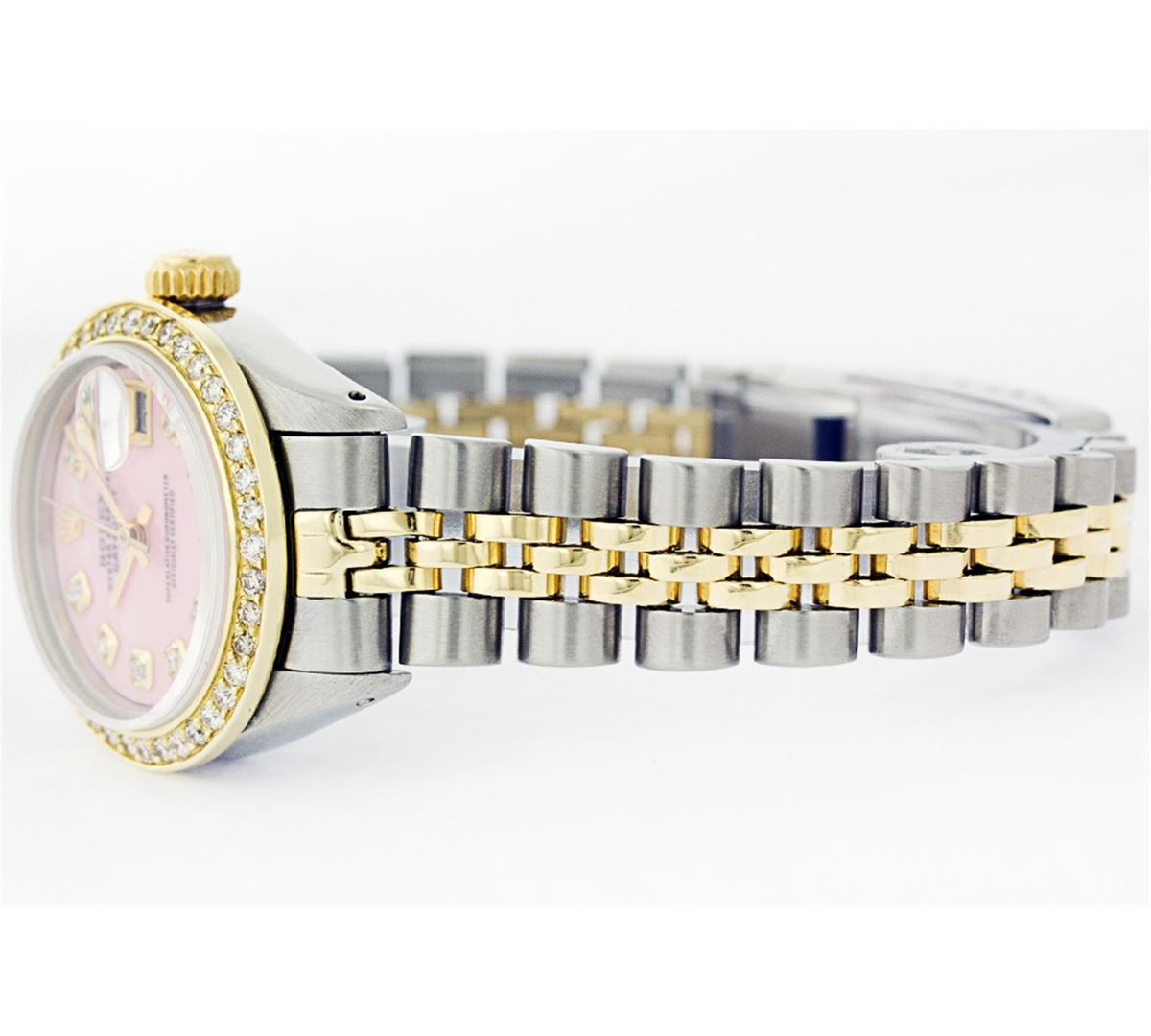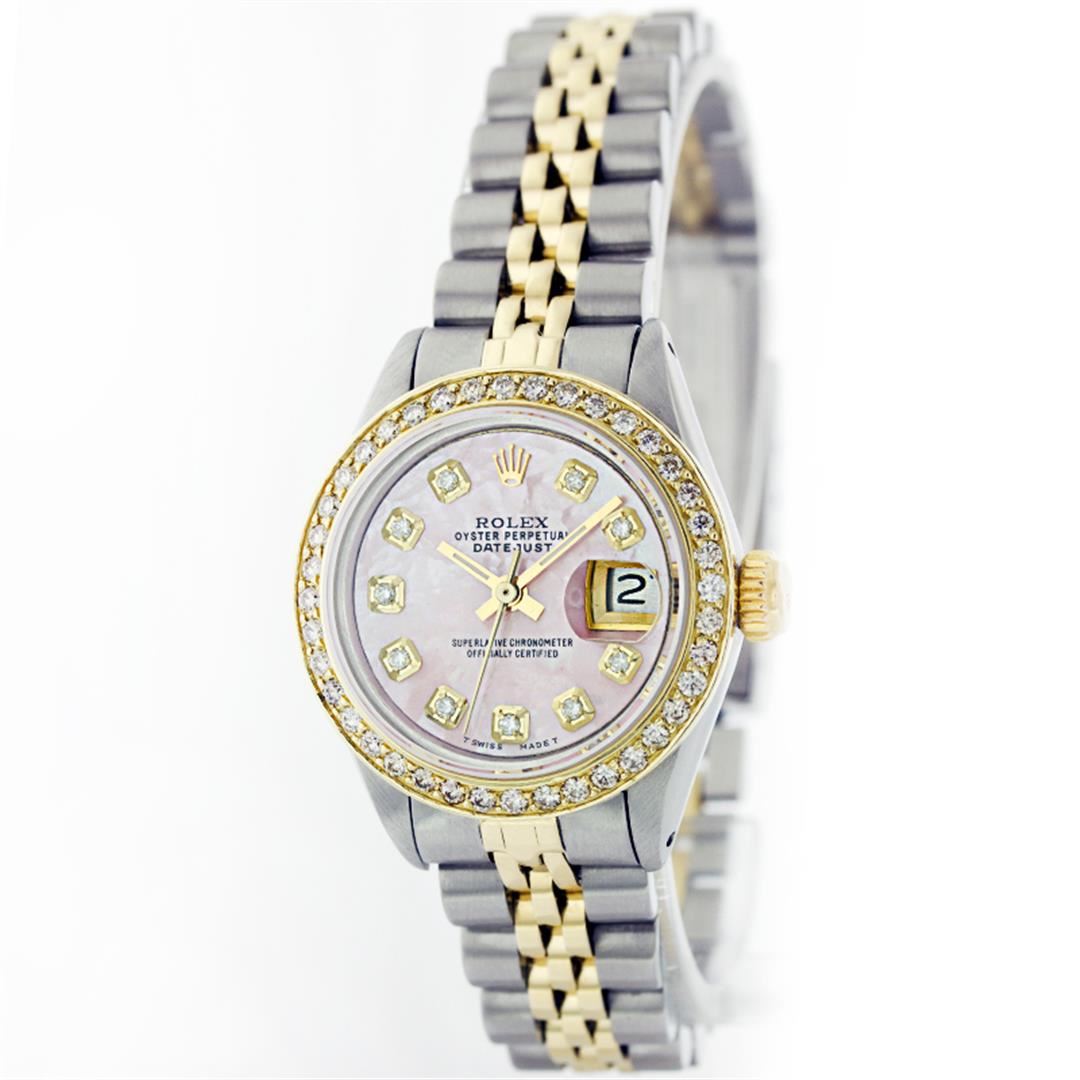 One Ladies Two Tone Rolex Datejust Polished, Serviced & Electronically Tested, 14K Yellow Gold & Stainless Steel Case:26mm, 14K Yellow Gold Crown, Custom Bezel: 18K Yellow Gold Beadset Diamond Bezel, Diamond Count: 32 Diamonds, Total Weight .70 Carat, Clarity: Si-VS, Color: G to H. Custom Crystal: Synthetic Sapphire Cyclops Lens. Movement: Automatic Winding Movement Caliber 2030. Custom Dial: Light Pink Mother Of Pearl Diamond Dial, Stone Count: 10 Diamonds in Dial. Date Window: 3 O'Clock Position Date Display, Non Quickset, Model: Datejust Condition: G-6 Extra Fine. Bracelet: Two Tone 14K Yellow Gold & Stainless Steel Jubilee. Bright Polish. 5.5 Inch Length, Adjustable. Standard Clasp, With Rolex Logo.