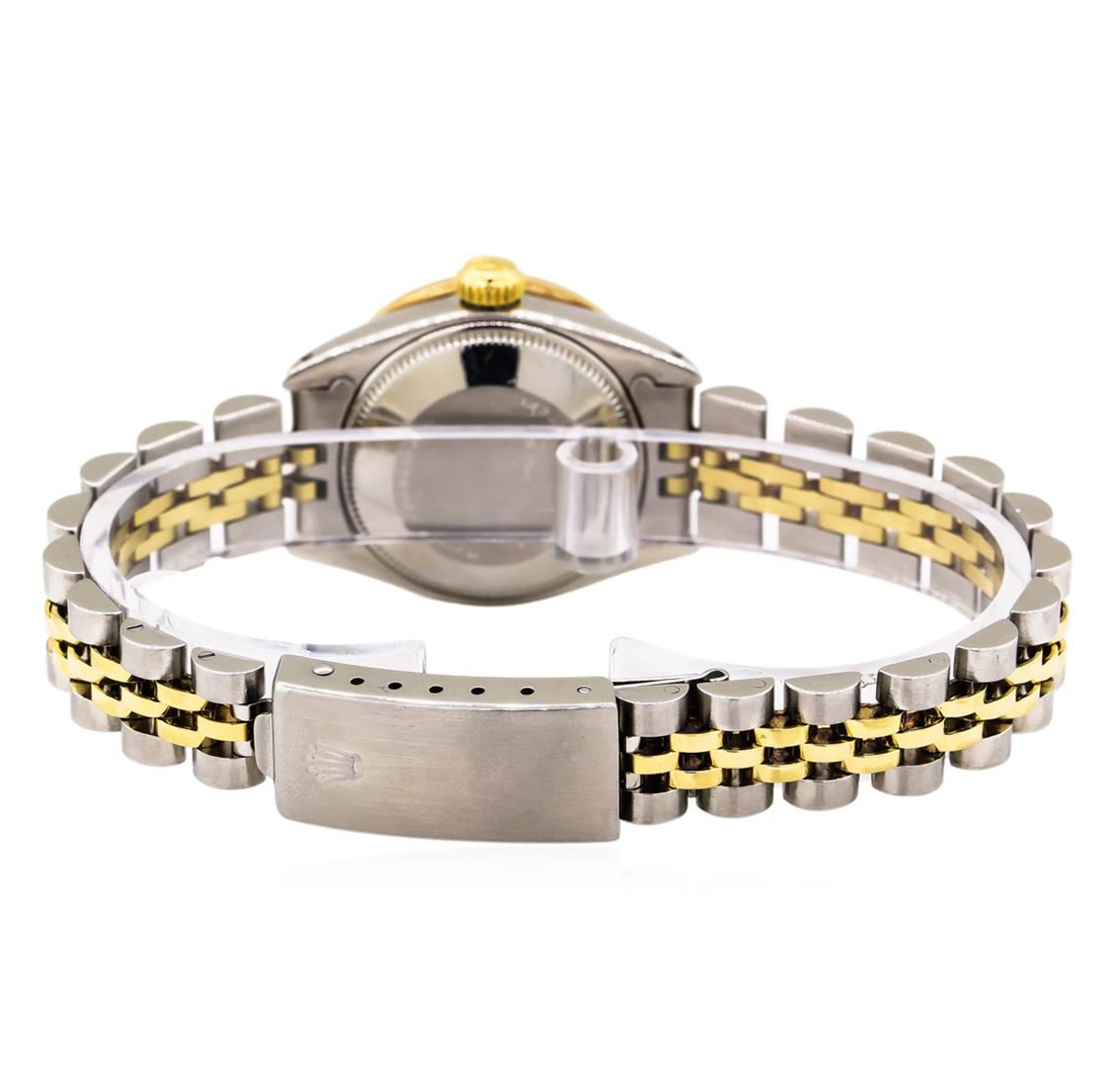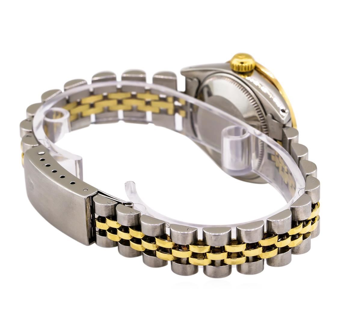 One ladies, hand crafted & machine milled Rolex Date Model wristwatch electronically tested, Stainless Steel Case: 26mm oyster, Crown: 14KT yellow gold twinlock with logo, non-factory Custom Bezel: diamond set, Crystal: acrylic cyclops lens. Movement: automatic. Rolex signed Dial: Champagne color, with baton hands, and indices, Date Window: 3 o'clock position date display, non-quick set, Circa: 1980, Condition: G-5 Fine. Rolex Bracelet: stainless steel and 14KT yellow gold jubilee links. Bright polish & brushed finish. Six and three quarter inch length, adjustable. Standard clasp, with logo. Containing: Forty round brilliant cut diamonds, measuring an average of 1.60mm in diameter, approximate total weight of 40 stones = 0.62ct. Set and graded in the custom bezel. Clarity: SI-1 to I-1. Color: G - I. Total Weight of Diamonds 0.62ct. Total Weight of Watch 53.16gm. AIG Appraised at $6,880.00.