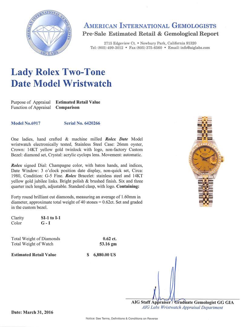 One ladies, hand crafted & machine milled Rolex Date Model wristwatch electronically tested, Stainless Steel Case: 26mm oyster, Crown: 14KT yellow gold twinlock with logo, non-factory Custom Bezel: diamond set, Crystal: acrylic cyclops lens. Movement: automatic. Rolex signed Dial: Champagne color, with baton hands, and indices, Date Window: 3 o'clock position date display, non-quick set, Circa: 1980, Condition: G-5 Fine. Rolex Bracelet: stainless steel and 14KT yellow gold jubilee links. Bright polish & brushed finish. Six and three quarter inch length, adjustable. Standard clasp, with logo. Containing: Forty round brilliant cut diamonds, measuring an average of 1.60mm in diameter, approximate total weight of 40 stones = 0.62ct. Set and graded in the custom bezel. Clarity: SI-1 to I-1. Color: G - I. Total Weight of Diamonds 0.62ct. Total Weight of Watch 53.16gm. AIG Appraised at $6,880.00.