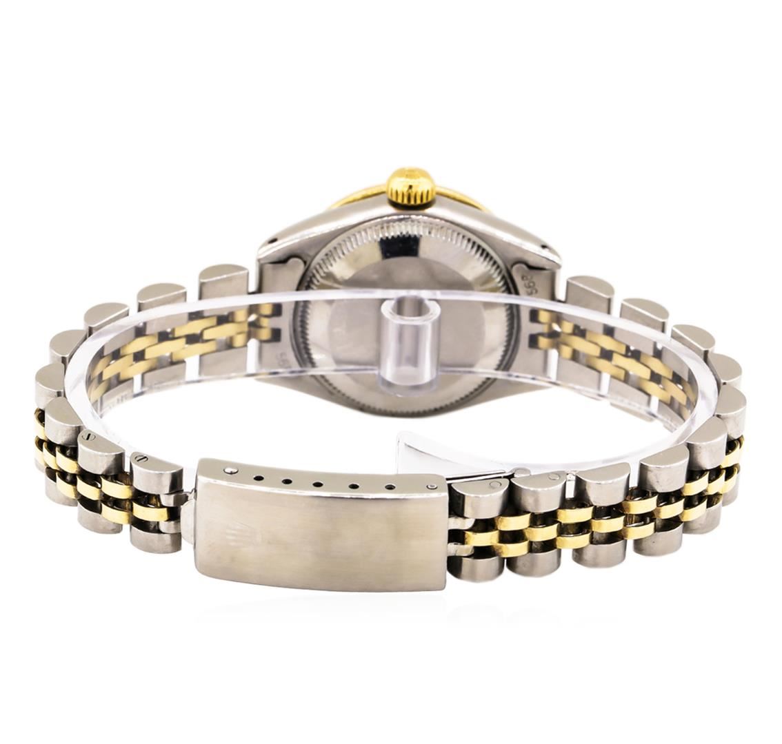 One ladies, hand crafted & machine milled Rolex DateJust Model wristwatch electronically tested, Stainless Steel Case: 25mm oyster, Crown: 14KT yellow gold twinlock with logo, non-factory Custom Bezel: diamond set, Crystal: acrylic cyclops lens. Movement: superlative chronometer. Rolex signed Customized Dial: Champagne color, with baton hands, and diamond markers, Light Ivory color Date Window: 3 o'clock position date display, non-quick set, Circa: 1972, Condition: G-5 Fine. Rolex Bracelet: stainless steel and 14KT yellow gold jubilee links. Bright polish & brushed finish. Six and one quarter inch length, adjustable. Rolex Hallmarked clasp, with logo. Containing: Forty prong set round brilliant cut diamonds, 1.55mm in diameter average, approximate total weight of 40 stones = 0.54ct. Set and graded in the custom bezel. Clarity: VS-1 to SI-1 Average. Color: F - H. Total Weight of Diamonds 0.54ct. Total Weight of Watch 47.74gm. AIG Appraised at $6,880.00.