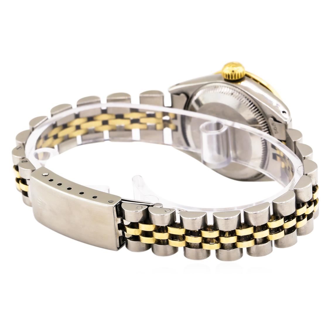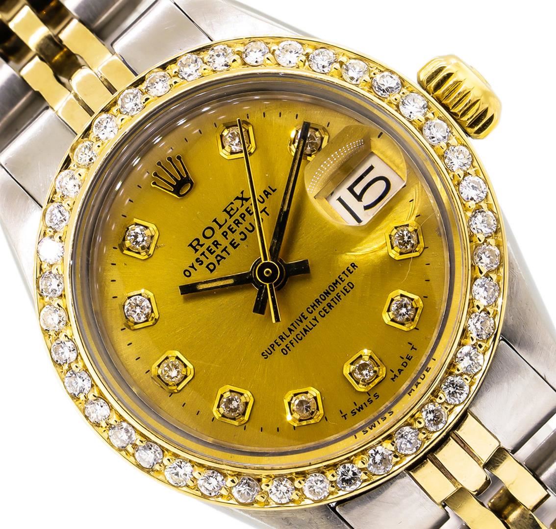 One ladies, hand crafted & machine milled Rolex DateJust Model wristwatch electronically tested, Stainless Steel Case: 25mm oyster, Crown: 14KT yellow gold twinlock with logo, non-factory Custom Bezel: diamond set, Crystal: acrylic cyclops lens. Movement: superlative chronometer. Rolex signed Customized Dial: Champagne color, with baton hands, and diamond markers, Light Ivory color Date Window: 3 o'clock position date display, non-quick set, Circa: 1972, Condition: G-5 Fine. Rolex Bracelet: stainless steel and 14KT yellow gold jubilee links. Bright polish & brushed finish. Six and one quarter inch length, adjustable. Rolex Hallmarked clasp, with logo. Containing: Forty prong set round brilliant cut diamonds, 1.55mm in diameter average, approximate total weight of 40 stones = 0.54ct. Set and graded in the custom bezel. Clarity: VS-1 to SI-1 Average. Color: F - H. Total Weight of Diamonds 0.54ct. Total Weight of Watch 47.74gm. AIG Appraised at $6,880.00.