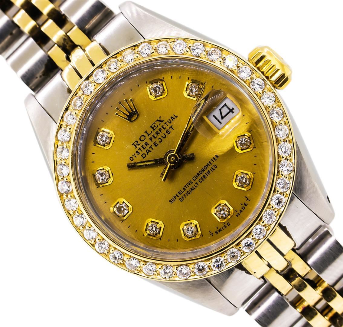 One ladies, hand crafted & machine milled Rolex DateJust Model wristwatch electronically tested, Stainless Steel Case: 26mm oyster, 14KT Yellow gold Crown: twinlock with logo, non-factory Custom Bezel: diamond set, Crystal: acrylic cyclops lens. Movement: superlative chronometer, Rolex signed Customized Dial: Champagne color, with baton hands & diamond markers, Calendar: 3 o'clock position date display, Light Ivory color, non-quick set, Circa: 1980, Condition: G-5 Fine, Rolex Bracelet: stainless steel and 14KT yellow gold jubilee links. Seven inch length, adjustable. Rolex Hallmarked clasp, with logo. Containing: Forty prong set round brilliant diamonds, measuring an average of 1.60mm in diameter, approximate total weight of 40 stones equals 0.60ct. Set & graded in the custom bezel. Clarity: SI-1 to SI-2 Average. Color: F - H. Total Weight of Diamonds 0.60ct. Total Weight of Watch 49.89gm. AIG Appraised at $7,220.00.