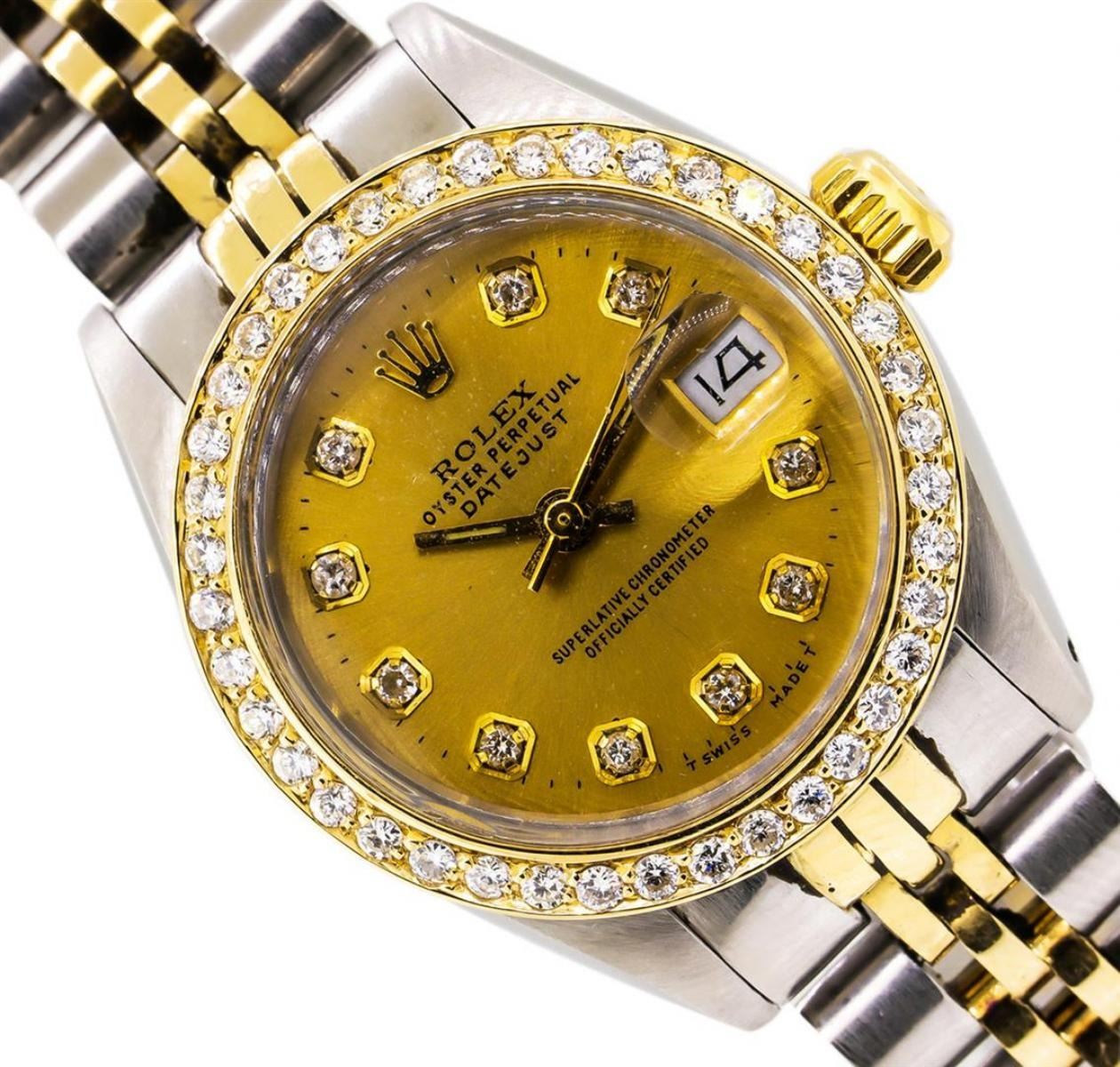 One ladies, hand crafted & machine milled Rolex DateJust Model wristwatch electronically tested, Stainless Steel Case: 26mm oyster, 14KT Yellow gold Crown: twinlock with logo, non-factory Custom Bezel: diamond set, Crystal: acrylic cyclops lens. Movement: superlative chronometer, Rolex signed Customized Dial: Champagne color, with baton hands & diamond markers, Calendar: 3 o'clock position date display, Light Ivory color, non-quick set, Circa: 1980, Condition: G-5 Fine, Rolex Bracelet: stainless steel and 14KT yellow gold jubilee links. Seven inch length, adjustable. Rolex Hallmarked clasp, with logo. Containing: Forty prong set round brilliant diamonds, measuring an average of 1.60mm in diameter, approximate total weight of 40 stones equals 0.60ct. Set & graded in the custom bezel. Clarity: SI-1 to SI-2 Average. Color: F - H. Total Weight of Diamonds 0.60ct. Total Weight of Watch 49.89gm. AIG Appraised.