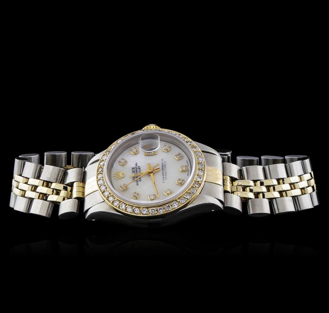 One ladies, hand crafted & machine milled Rolex DateJust Model wristwatch electronically tested, Stainless Steel Case: 26mm oyster, Crown: 14KT yellow gold twinlock with logo, Custom Bezel: diamond set, Custom Crystal: acrylic cyclops lens. Movement: superlative chronometer. Custom Dial: mother of pearl, with baton hands, and diamond markers, Date Window: 3 o'clock position date display, non-quick set, Circa: 1972, Condition: G-5 Fine. Rolex Bracelet: stainless steel and 14KT yellow gold jubilee links. Bright polish & brushed finish. Six inch length, adjustable. Standard clasp, with logo. Containing: Forty prong set round brilliant cut diamonds, 1.50mm in diameter average, approximate total weight of 40 stones = 0.49ct. Set and graded in the custom bezel. Clarity: SI-1 to I-1. Color: F - H. Total Weight of Diamonds 0.49ct. Total Weight of Watch 53.52gm. AIG Appraised at $6,880.00.