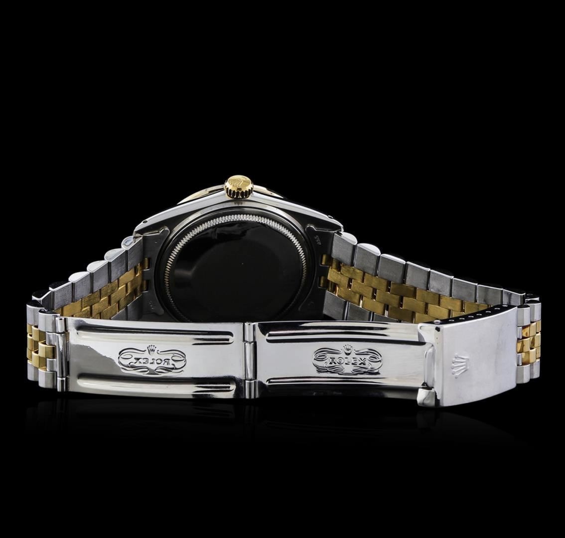 One gents, hand crafted & machine milled Rolex two-tone DateJust wristwatch electronically tested, Stainless Steel Case: 36mm oyster, 14KT yellow gold Crown: twinlock with logo, Custom Bezel: diamond set, Custom Crystal: synthetic sapphire cyclops lens, Circa: 1980.Movement: superlative chronometer, Customized Maroon color Dial: with baton hands and diamond markers, Date Window: 3 o'clock position, quick set, Rolex Bracelet: two-tone 14KT yellow gold & stainless steel jubilee, bright polish & brushed finish, Condition: G-5 Fine. Seven inch length, adjustable. Standard clasp, with logo. Containing: Forty Four prong set round brilliant cut diamonds, measuring an average of 1.65mm in diameter, approximate total weight of 44 Stones = 0.72ct. Set & graded in the custom bezel. Clarity: VS-2 to SI-2. Color: F - H. Total Weight of Diamonds 0.72ct. Total Weight of Watch 93.89gm. AIG Appraised at $7,880.00.