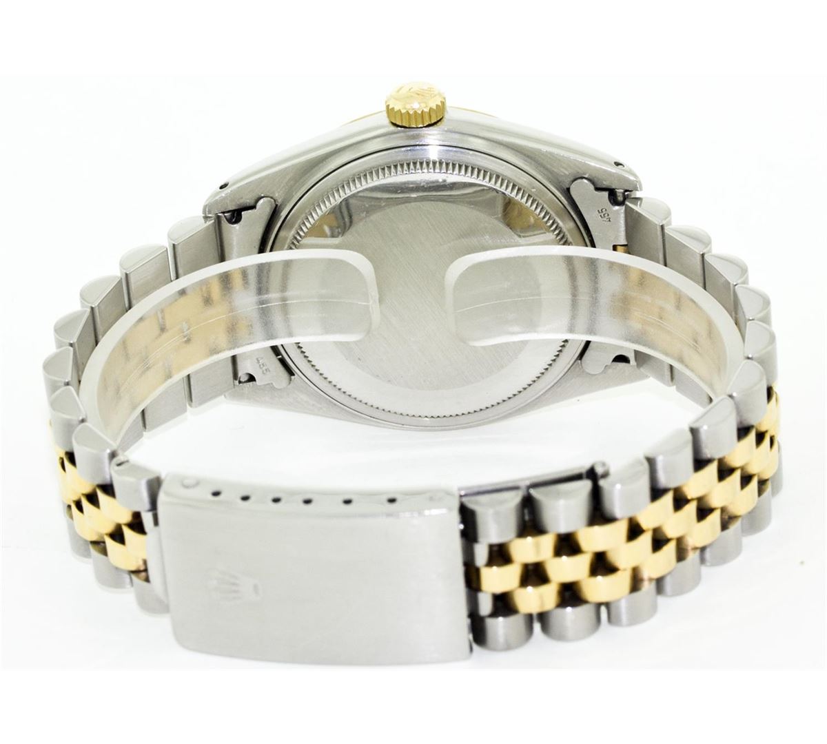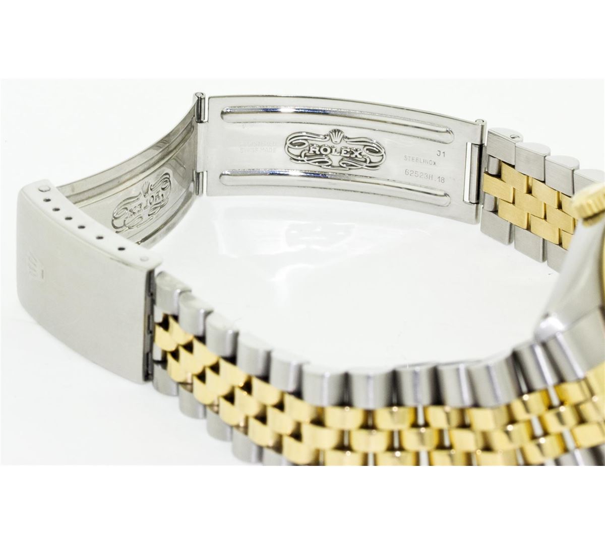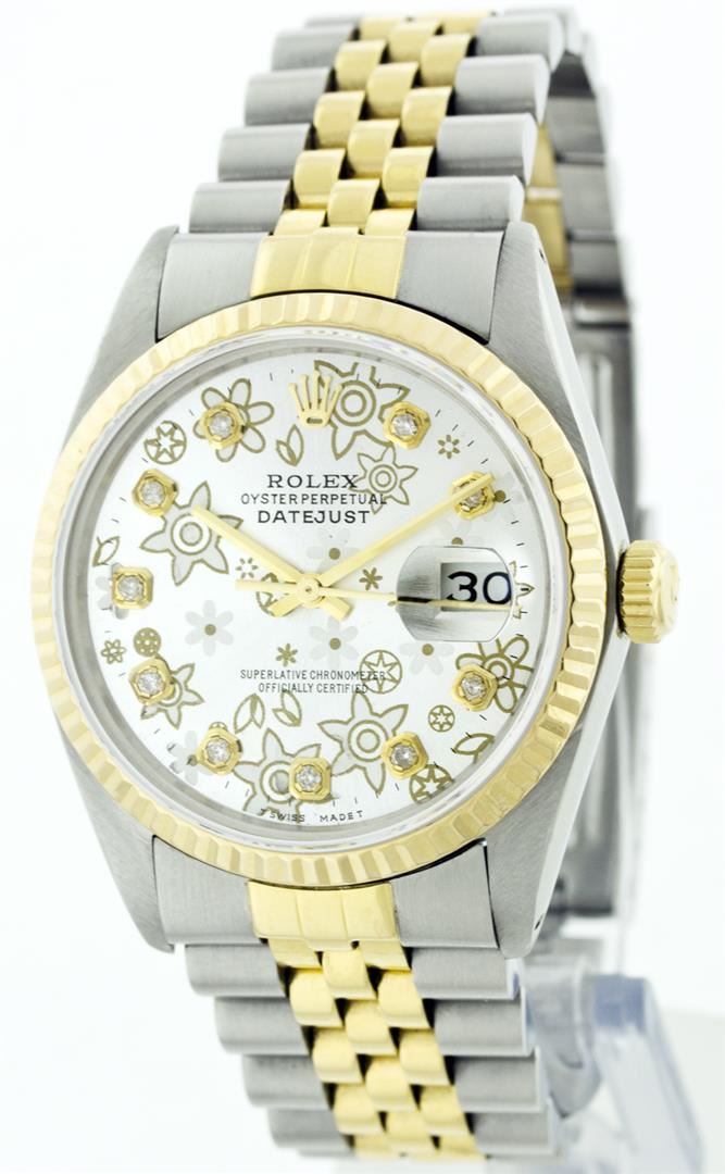 One Gents Two Tone Rolex Datejust Polished, Serviced & Electronically Tested, 14K Yellow Gold & Stainless Steel Case:36mm, 14K Yellow Gold Crown, Bezel: 14K Yellow Gold Fluted Bezel. Custom Crystal: Acrylic Cyclops Lens. Movement: Automatic Winding Movement Caliber 3035. Custom Dial: Silver Floral With Diamond Hour Markers and Small Tracks, Diamond Count: 10 Diamonds, Color: G to H, Clarity: SI-VS Date Window: 3 O'clock Position Date Display, Quickset, Model: 16013 Condition: G-6 Extra Fine. Bracelet: Two Tone 14K Yellow Gold & Stainless Steel Jubilee. Bright Polish. 6.5 Inch Length, Adjustable. Standard Clasp, With Rolex Logo.