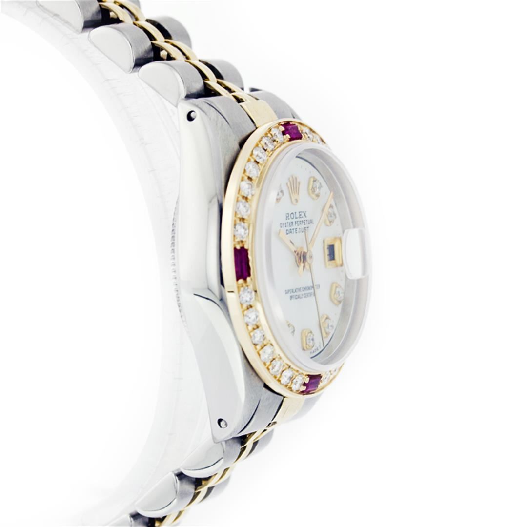 One Ladies Two Tone Rolex Datejust Polished, Serviced & Electronically Tested, 14K Yellow Gold & Stainless Steel Case:26mm, 14K Yellow Gold Crown, Custom Bezel: 18K Yellow Gold Ruby Beadset Diamond Bezel, Stone Count: 28 Diamonds + 4 Rubies, Total Weight .70 Carat, Clarity: Si-VS, Color: G to H. Custom Crystal: Synthetic Sapphire Cyclops Lens. Movement: Automatic Winding Movement Caliber 2030. Custom Dial: Mother Of Pearl Diamond Dial With Small Tracks, Stone Count: 10 Diamonds in Dial. Date Window: 3 O'Clock Position Date Display, Non Quickset, Model: Datejust, Condition: G-6 Extra Fine. Bracelet: Two Tone 14K Yellow Gold & Stainless Steel Jubilee. Bright Polish. 5.5 Inch Length, Adjustable. Standard Clasp, With Rolex Logo.