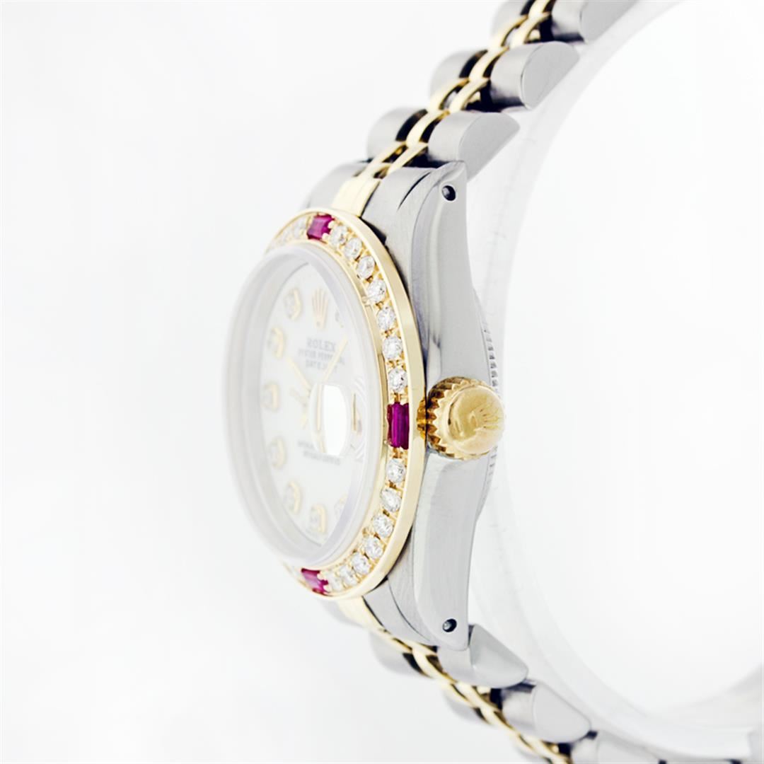 One Ladies Two Tone Rolex Datejust Polished, Serviced & Electronically Tested, 14K Yellow Gold & Stainless Steel Case:26mm, 14K Yellow Gold Crown, Custom Bezel: 18K Yellow Gold Ruby Beadset Diamond Bezel, Stone Count: 28 Diamonds + 4 Rubies, Total Weight .70 Carat, Clarity: Si-VS, Color: G to H. Custom Crystal: Synthetic Sapphire Cyclops Lens. Movement: Automatic Winding Movement Caliber 2030. Custom Dial: Mother Of Pearl Diamond Dial With Small Tracks, Stone Count: 10 Diamonds in Dial. Date Window: 3 O'Clock Position Date Display, Non Quickset, Model: Datejust, Condition: G-6 Extra Fine. Bracelet: Two Tone 14K Yellow Gold & Stainless Steel Jubilee. Bright Polish. 5.5 Inch Length, Adjustable. Standard Clasp, With Rolex Logo.