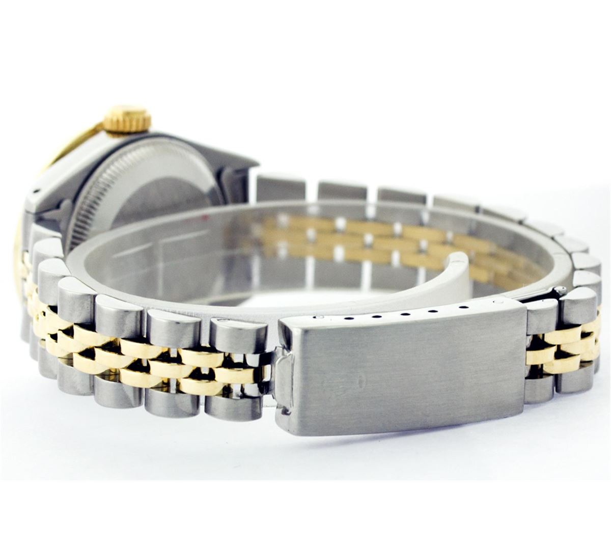 One Ladies Two Tone Rolex Datejust Polished, Serviced & Electronically Tested, 14K Yellow Gold & Stainless Steel Case:26mm, 14K Yellow Gold Crown, Custom Bezel: 18K Yellow Gold Ruby Beadset Diamond Bezel, Stone Count: 28 Diamonds + 4 Rubies, Total Weight .70 Carat, Clarity: Si-VS, Color: G to H. Custom Crystal: Synthetic Sapphire Cyclops Lens. Movement: Automatic Winding Movement Caliber 2030. Custom Dial: Mother Of Pearl Diamond Dial With Small Tracks, Stone Count: 10 Diamonds in Dial. Date Window: 3 O'Clock Position Date Display, Non Quickset, Model: Datejust, Condition: G-6 Extra Fine. Bracelet: Two Tone 14K Yellow Gold & Stainless Steel Jubilee. Bright Polish. 5.5 Inch Length, Adjustable. Standard Clasp, With Rolex Logo.