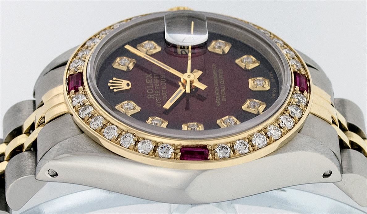 One Ladies Two Tone Rolex Datejust Polished, Serviced & Electronically Tested, 14K Yellow Gold & Stainless Steel Case:26mm, 14K Yellow Gold Crown, Custom Bezel: 18K Yellow Gold Ruby Beadset Diamond Bezel, Diamond Count: 28 Diamonds + 4 Rubies Total Weight .70 Carat, Clarity: Si-VS, Color: G to H. Custom Crystal: Synthetic Sapphire Cyclops Lens. Movement: Automatic Winding Movement Caliber 2030. Custom Dial: Dark Red Vignette With Diamond Hour Markers. 10 Diamonds In Dial, Clarity: Si-VS, Color: G to H. Date Window: 3 O'Clock Position Date Display, Non Quickset, Model: Datejust Condition: G-6 Extra Fine. Bracelet: Two Tone 14K Yellow Gold & Stainless Steel Jubilee. Bright Polish. 6.0 Inch Length, Adjustable. Standard Clasp, With Rolex Logo.