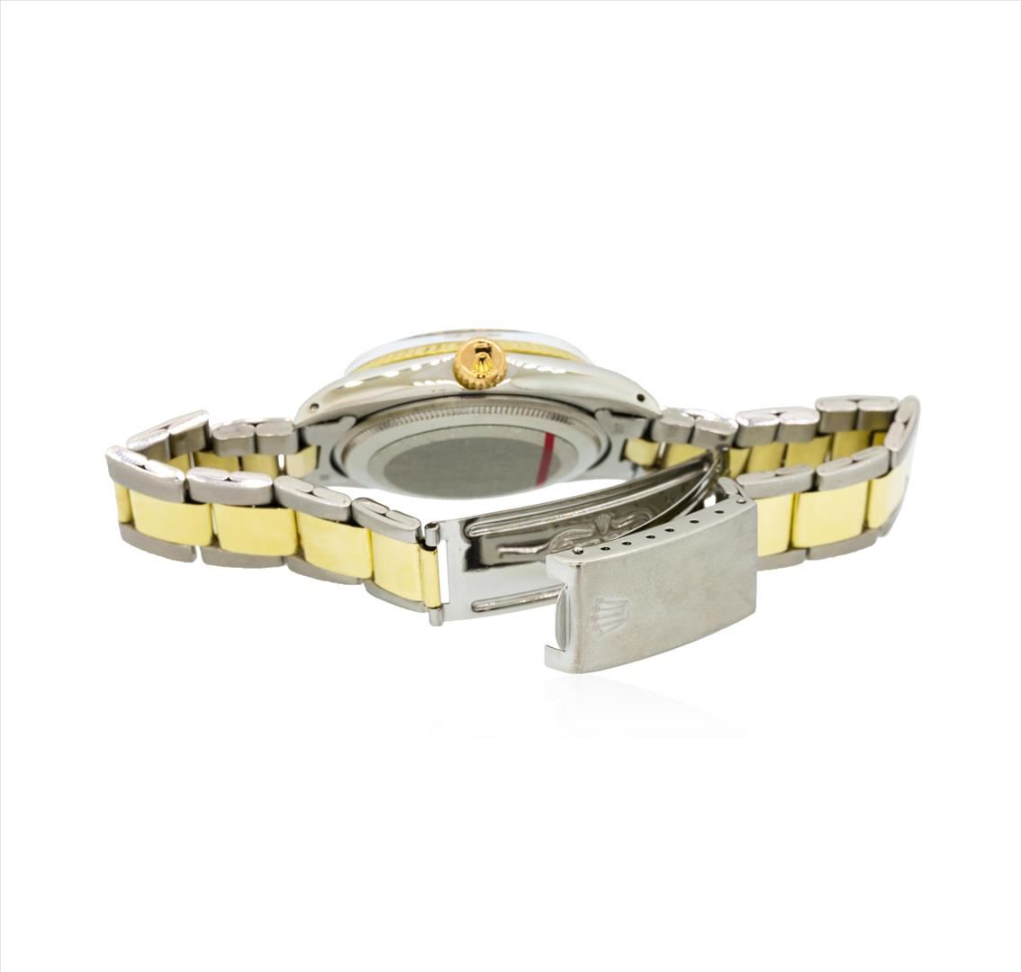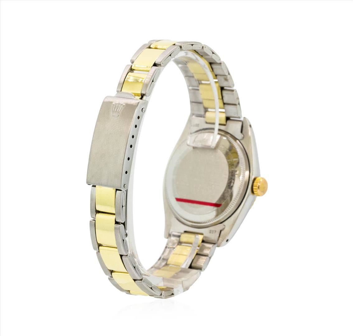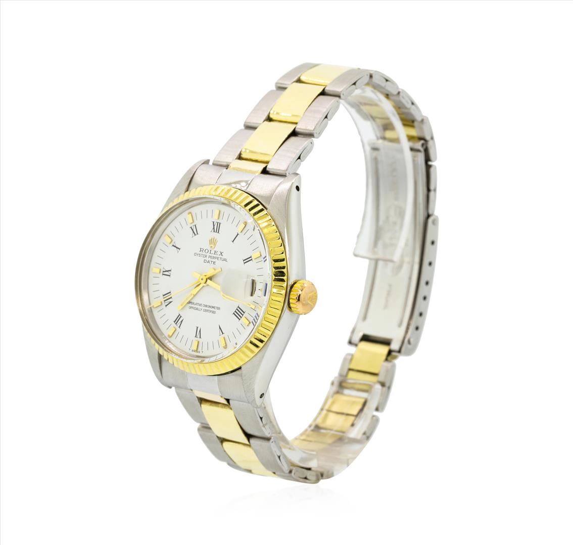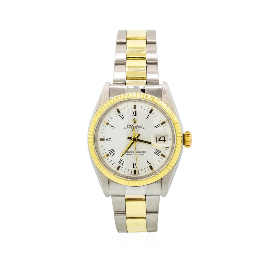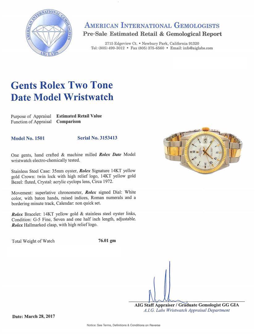One gents, hand crafted & machine milled Rolex Date Model wristwatch electro-chemically tested. Stainless Steel Case: 35mm oyster, Rolex Signature 14KT yellow gold Crown: twin lock with high relief logo, 14KT yellow gold Bezel: fluted, Crystal: acrylic cyclops lens, Circa 1972.Movement: superlative chronometer, Rolex signed Dial: White color, with baton hands, raised indices, Roman numerals and a bordering minute track, Calendar: non quick set.Rolex Bracelet: 14KT yellow gold & stainless steel oyster links, Condition: G-5 Fine, Seven and one half inch length, adjustable. Rolex Hallmarked clasp, with high relief logo. Total Weight of Watch 76.01gm. AIG Appraised.
