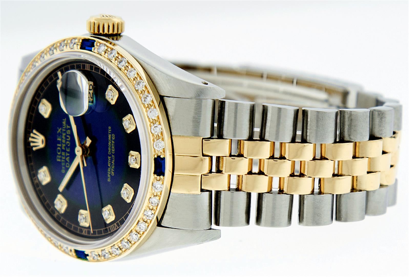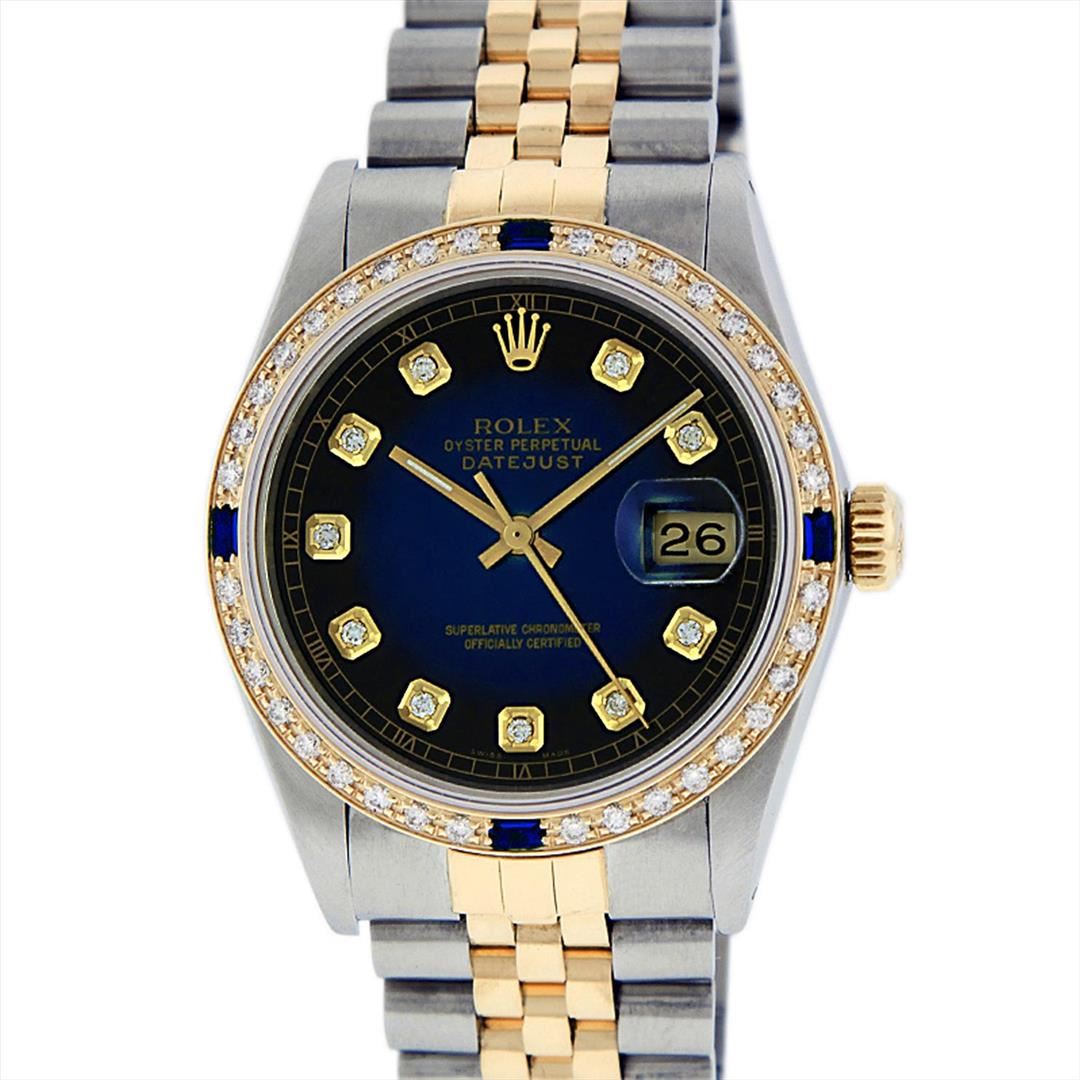 One Mens Two Tone Rolex Datejust Polished, Fully Serviced & Electronically Tested, 14K Yellow Gold & Stainless Steel Case:36mm, 14K Yellow Gold Crown, Custom Bezel: 18K Yellow Gold Sapphire Beadset Diamond Bezel, Diamond Count: 36 Diamonds + 4 Sapphires, Total Weight 1.0 Carat, Clarity: Si-VS, Color: G to H. Custom Crystal: Synthetic Sapphire Cyclops Lens. Movement: Automatic Winding Movement Caliber 3035. Custom Dial: Blue Vignette Diamond Dial With Square Roman Track. Diamond Count: 10 Diamonds In Dial, Color: G to H, Clarity: SI-VS. Date Window: 3 O'Clock Position Date Display, Quickset, Model: Datejust Condition: G-6 Extra Fine. Bracelet: Two Tone 14K Yellow Gold & Stainless Steel Jubilee Band. Bright Polish. 7.0 Inch Length, Adjustable. Standard Clasp, With Rolex Logo.