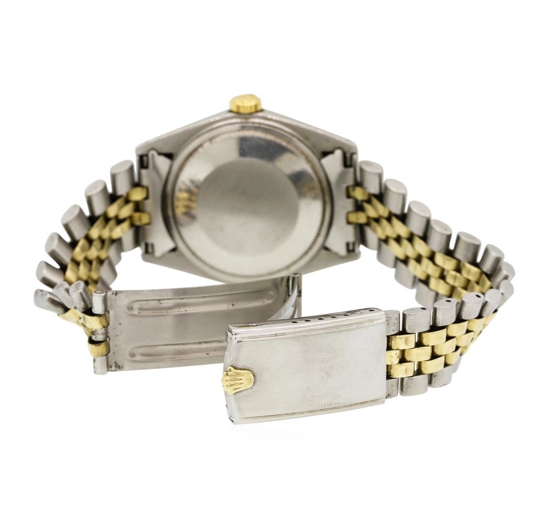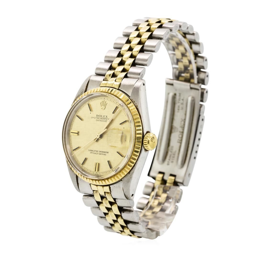 One 14KT two tone yellow gold and stainless steel Rolex men's Oyster Perpetual Datejust wristwatch with a case measuring 36 millimeters. The case has a fluted gold bezel with a gold dial with stick markers and baton type hands and a date window at 3 o'clo