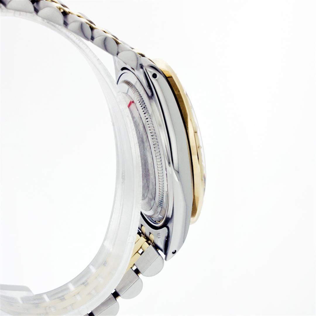 One Gents Two Tone Rolex Datejust Polished, Fully Serviced & Electronically Tested, 14K Yellow Gold & Stainless Steel Case:36mm, 14K Yellow Gold Crown, Custom Bezel: 18K Yellow Gold Pyramid Diamond Bezel, Diamond Count: 24 Diamonds, Total Weight .75 Carat, Clarity: Si-VS, Color: G to H. Custom Crystal: Synthetic Sapphire Cyclops Lens. Movement: Automatic Winding Movement Caliber 3035. Custom Dial: Black Onyx Baguette Diamond Dial, Diamond Count: 2 Baguette Diamonds In Dial, Color: G to H, Clarity: SI -VS. Date Window: 3 O'Clock Position Date Display, Quickset, Model: Datejust Condition: G-6 Extra Fine. Bracelet: Two Tone 14K Yellow Gold & Stainless Steel Jubilee. Bright Polish. 6.5 Inch Length, Adjustable. Standard Clasp, With Rolex Logo. Comes with a six month warranty card.