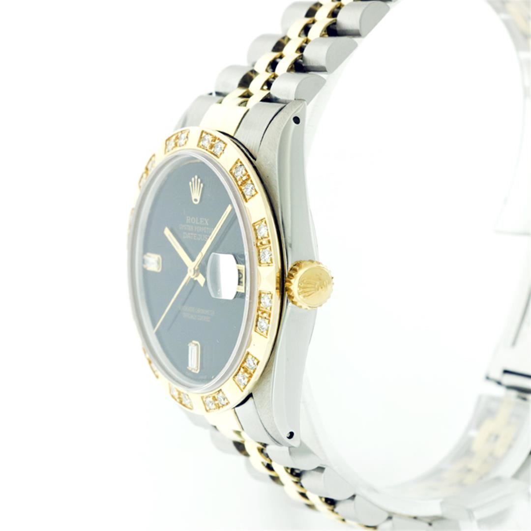 One Gents Two Tone Rolex Datejust Polished, Fully Serviced & Electronically Tested, 14K Yellow Gold & Stainless Steel Case:36mm, 14K Yellow Gold Crown, Custom Bezel: 18K Yellow Gold Pyramid Diamond Bezel, Diamond Count: 24 Diamonds, Total Weight .75 Carat, Clarity: Si-VS, Color: G to H. Custom Crystal: Synthetic Sapphire Cyclops Lens. Movement: Automatic Winding Movement Caliber 3035. Custom Dial: Black Onyx Baguette Diamond Dial, Diamond Count: 2 Baguette Diamonds In Dial, Color: G to H, Clarity: SI -VS. Date Window: 3 O'Clock Position Date Display, Quickset, Model: Datejust Condition: G-6 Extra Fine. Bracelet: Two Tone 14K Yellow Gold & Stainless Steel Jubilee. Bright Polish. 6.5 Inch Length, Adjustable. Standard Clasp, With Rolex Logo.