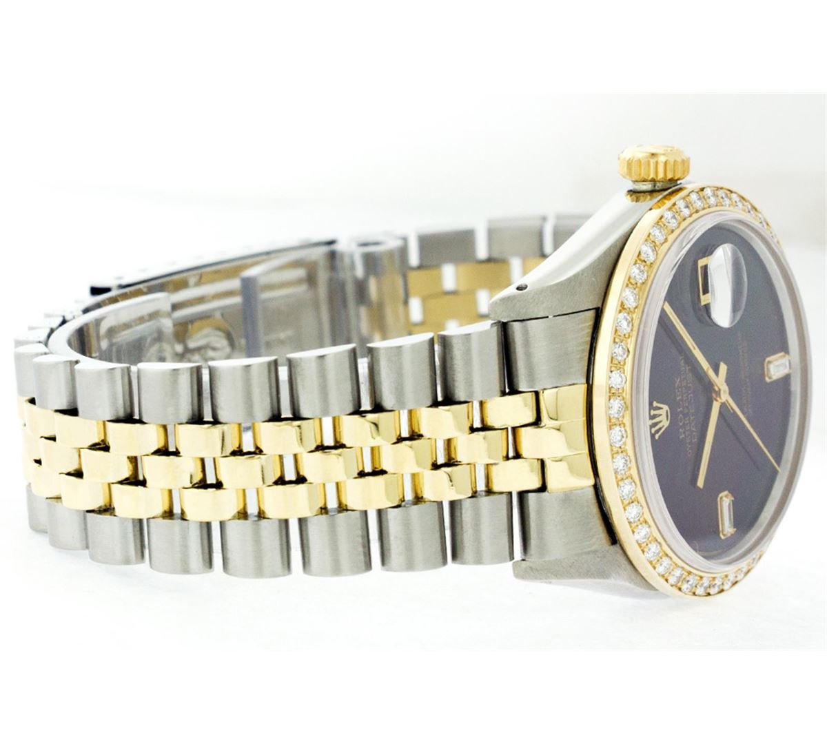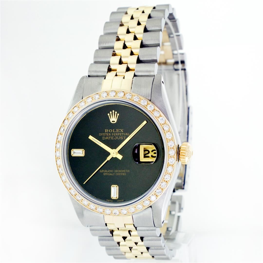 One Gents Two Tone Rolex Datejust Polished, Fully Serviced & Electronically Tested, 14K Yellow Gold & Stainless Steel Case:36mm, 14K Yellow Gold Crown, Custom Bezel: 18K Yellow Gold Beadset Diamond Bezel, Diamond Count: 44 Diamonds, Total Weight 1.00 Carat, Clarity: Si-VS, Color: G to H. Custom Crystal: Synthetic Sapphire Cyclops Lens. Movement: Automatic Winding Movement Caliber 3035. Custom Dial: Black Onyx Baguette Diamond Dial, Diamond Count: 2 Baguette Diamonds In Dial, Color: G to H, Clarity: SI -VS. Date Window: 3 O'Clock Position Date Display, Quickset, Model: Datejust Condition: G-6 Extra Fine. Bracelet: Two Tone 14K Yellow Gold & Stainless Steel Jubilee. Bright Polish. 6.5 Inch Length, Adjustable. Standard Clasp, With Rolex Logo.