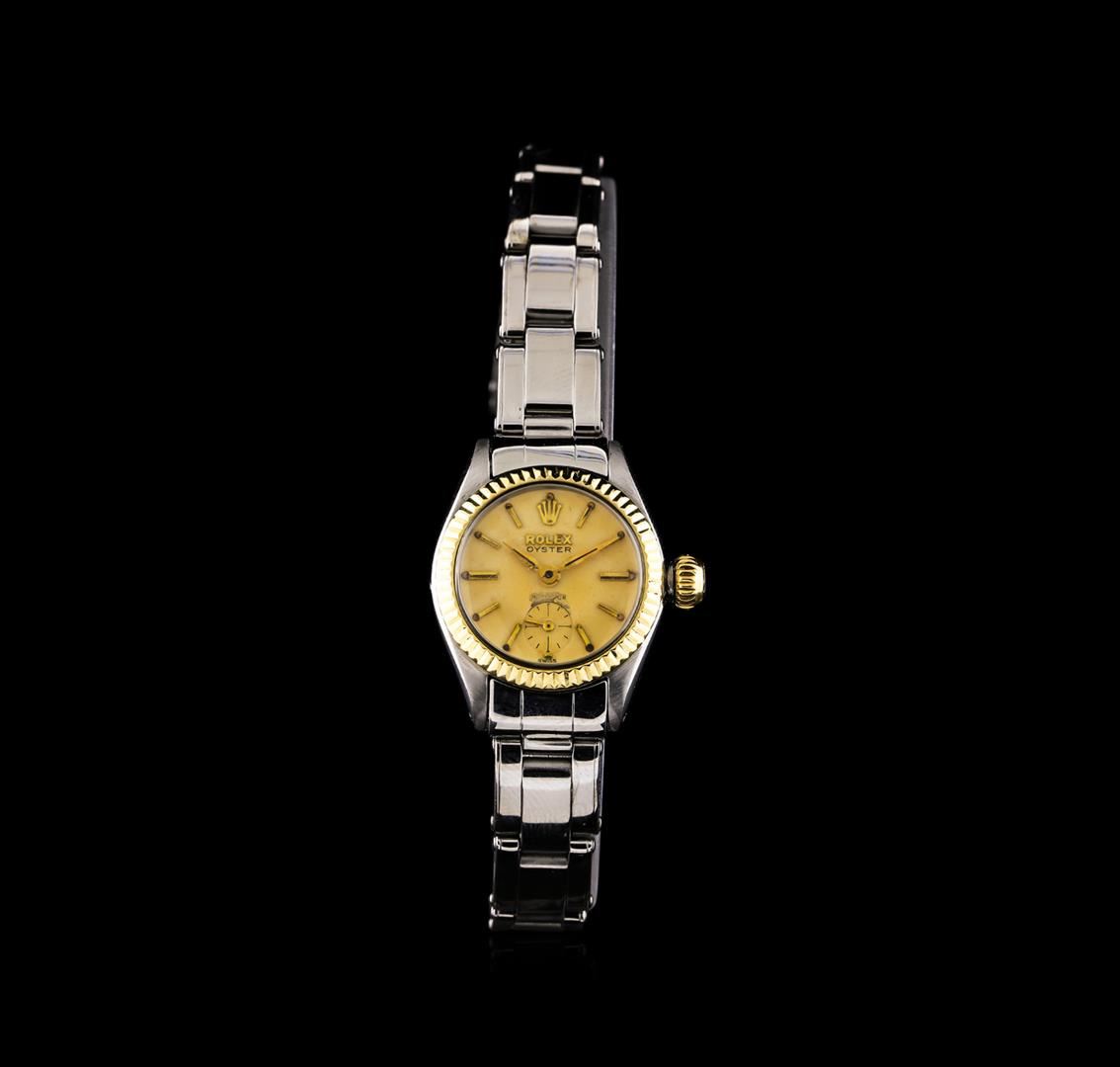 One ladies, vintage Rolex Oyster Precision Model wristwatch electronically tested, Stainless Steel Case: 22mm oyster, 14KT yellow gold Crown: twinlock with logo, Bezel: 14KT yellow gold fluted, Crystal: acrylic lens. Movement: mechanical stem wind, Rolex signed Dial: Champagne color, with baton hands, and indices. Seconds Sub Dial: 6 o'clock position, Circa: 1940, Condition: G-4 Average. Tapering Bracelet: stainless steel. Five and three quarter inch length, adjustable. Standard clasp, with logo. Total Weight of Watch 26.27gm. AIG Appraised at $3,050.00.