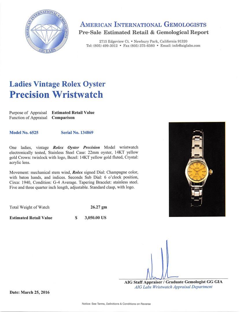 One ladies, vintage Rolex Oyster Precision Model wristwatch electronically tested, Stainless Steel Case: 22mm oyster, 14KT yellow gold Crown: twinlock with logo, Bezel: 14KT yellow gold fluted, Crystal: acrylic lens. Movement: mechanical stem wind, Rolex signed Dial: Champagne color, with baton hands, and indices. Seconds Sub Dial: 6 o'clock position, Circa: 1940, Condition: G-4 Average. Tapering Bracelet: stainless steel. Five and three quarter inch length, adjustable. Standard clasp, with logo. Total Weight of Watch 26.27gm. AIG Appraised at $3,050.00.