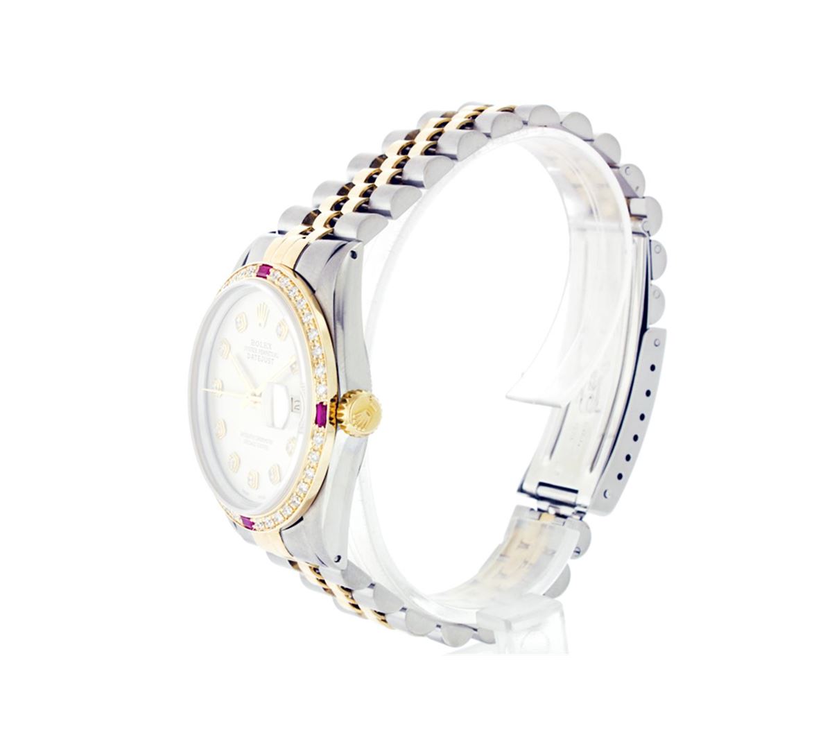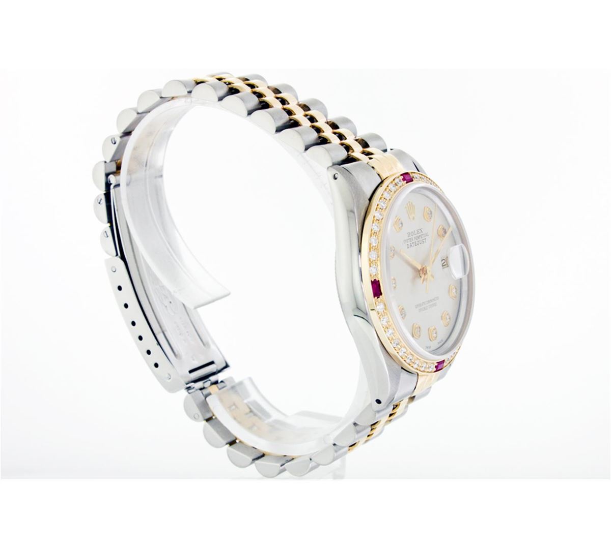 One Gents Two Tone Rolex Datejust Polished, Fully Serviced & Electronically Tested, 14K Yellow Gold & Stainless Steel Case:36mm, 14K Yellow Gold Crown, Custom Bezel: 18K Yellow Gold Ruby Beadset Diamond Bezel, Diamond Count: 36 Diamonds + 4 Rubies, Total Weight 1.0 Carat, Clarity: Si-VS, Color: G to H. Custom Crystal: Synthetic Sapphire Cyclops Lens. Movement: Automatic Winding Movement Caliber 3035. Custom Dial: Silver Diamond Dial, Diamond Count: 10 Diamonds In Dial, Color: G to H, Clarity: SI-VS. Date Window: 3 O'Clock Position Date Display, Quickset, Model: Datejust Condition: G-6 Extra Fine. Bracelet: Two Tone 14K Yellow Gold & Stainless Steel Jubilee. Bright Polish. 6.5 Inch Length, Adjustable. Standard Clasp, With Rolex Logo.