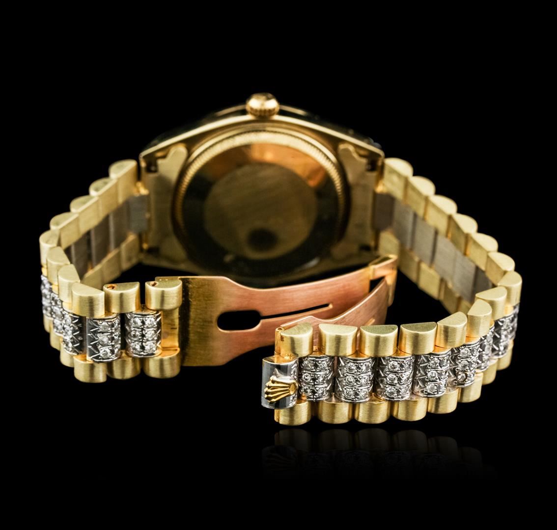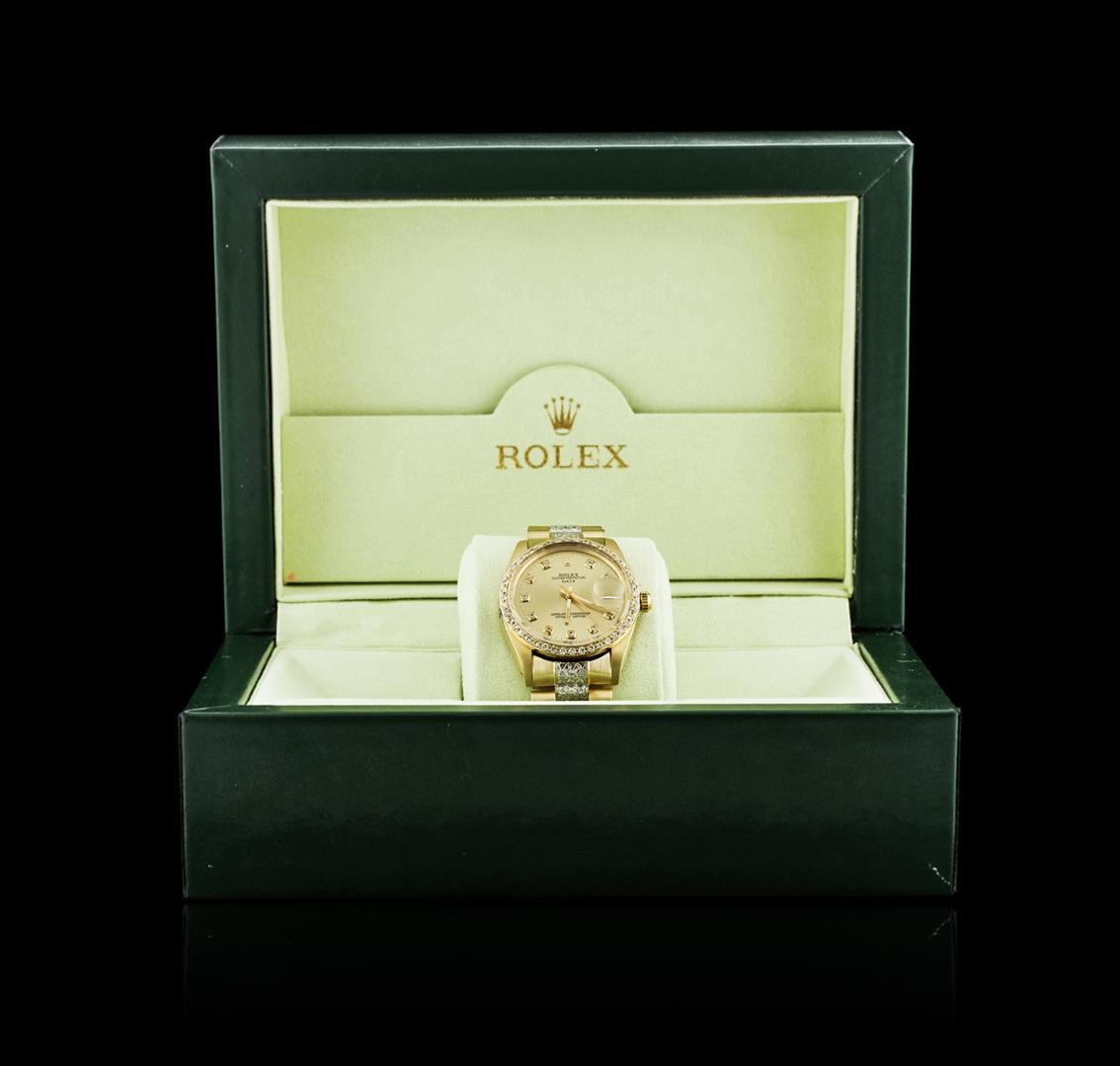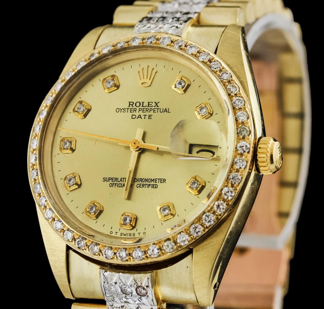One, hand crafted & machine milled Rolex Date Model wristwatch electronically tested 14KT yellow gold, Case: 35mm oyster, Crown: twin lock with logo, Custom Bezel: diamond set, Crystal: acrylic cyclops lens. Movement: superlative chronometer, Dial: Champagne, with baton hands and diamond markers, Circa: 1979, Calendar: non quickset, Custom Bracelet: 14KT yellow gold President style diamond set, Condition: G-4 Average. Seven and one half inch length, adjustable. Standard clasp, with logo. Containing: Approximately One Hundred Eighty Eight pave and prong set round brilliant cut diamonds, approximate total weight of Stones = 4.00ct. Set & graded in the bezel. Clarity: SI-1 to I-2. Color: G- H. Total Weight of Diamonds 4.00ct. Total Weight of Watch 124.94 grams. AIG Appraised at $23,550.00.