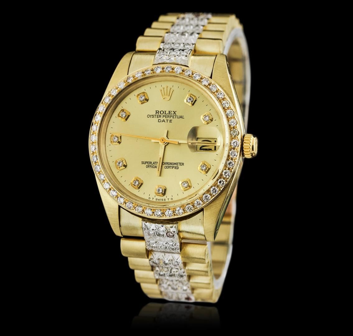 One, hand crafted & machine milled Rolex Date Model wristwatch electronically tested 14KT yellow gold, Case: 35mm oyster, Crown: twin lock with logo, Custom Bezel: diamond set, Crystal: acrylic cyclops lens. Movement: superlative chronometer, Dial: Champagne, with baton hands and diamond markers, Circa: 1979, Calendar: non quickset, Custom Bracelet: 14KT yellow gold President style diamond set, Condition: G-4 Average. Seven and one half inch length, adjustable. Standard clasp, with logo. Containing: Approximately One Hundred Eighty Eight pave and prong set round brilliant cut diamonds, approximate total weight of Stones = 4.00ct. Set & graded in the bezel. Clarity: SI-1 to I-2. Color: G- H. Total Weight of Diamonds 4.00ct. Total Weight of Watch 124.94 grams. AIG Appraised at $23,550.00.