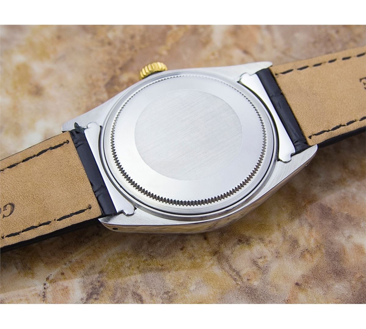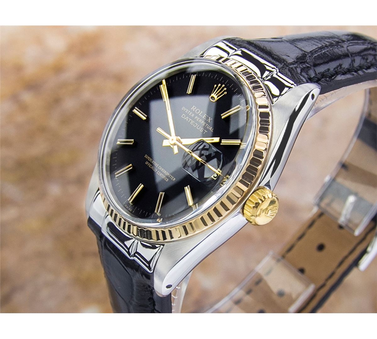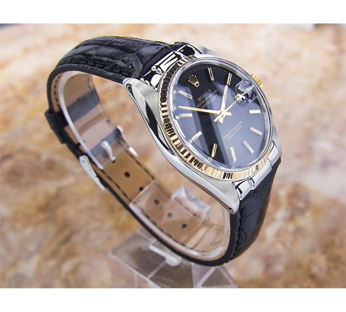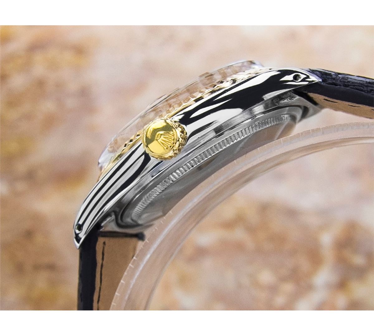 Rolex 1600 DateJust Two-Tone Automatic Watch. Brand: Rolex. Model: 1600 DateJust. Movement: Automatic. Case Material: Stainless Steel & SOLID GOLD. Crystal: ACRYLIC. Case Size: 44X36. Band: NEW LEATHER BAND WITH CUSTOM END LINK.