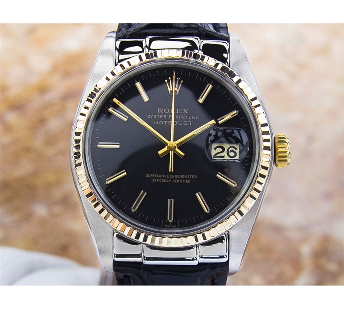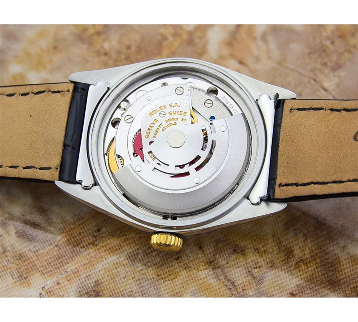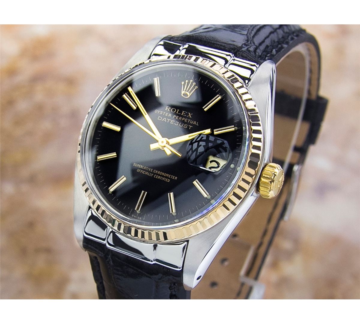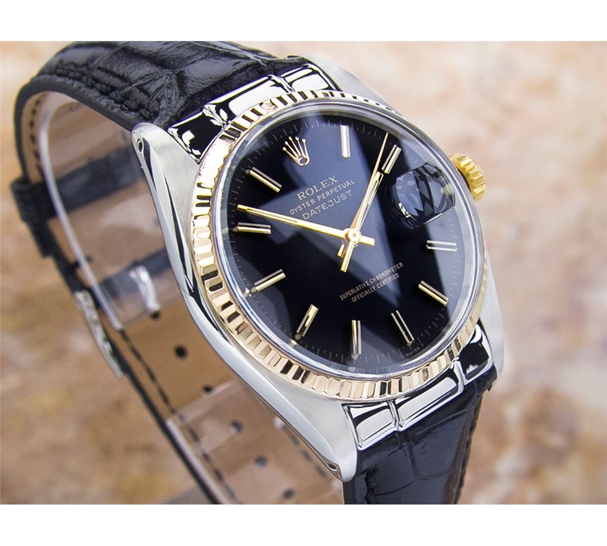 Rolex 1600 DateJust Two-Tone Automatic Watch. Brand: Rolex. Model: 1600 DateJust. Movement: Automatic. Case Material: Stainless Steel & SOLID GOLD. Crystal: ACRYLIC. Case Size: 44X36. Band: NEW LEATHER BAND WITH CUSTOM END LINK.