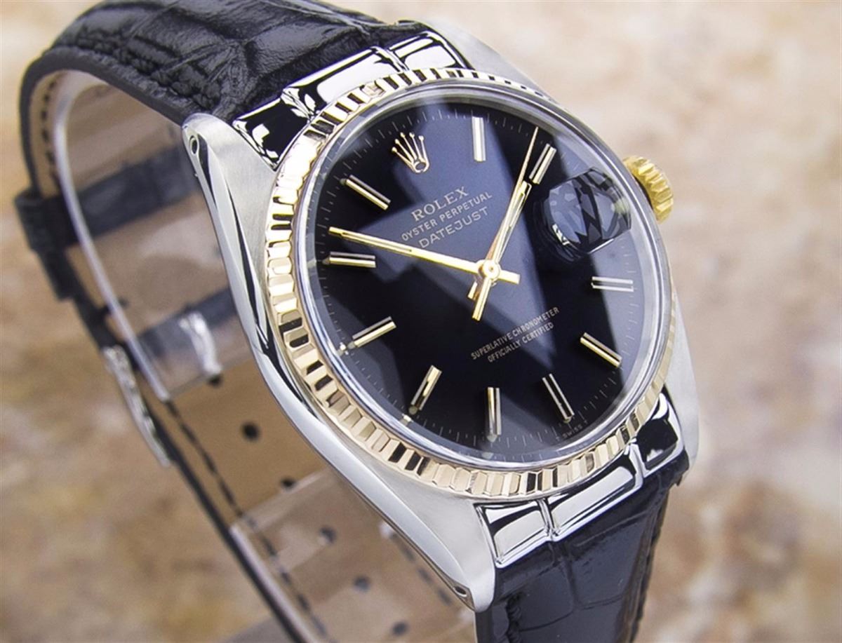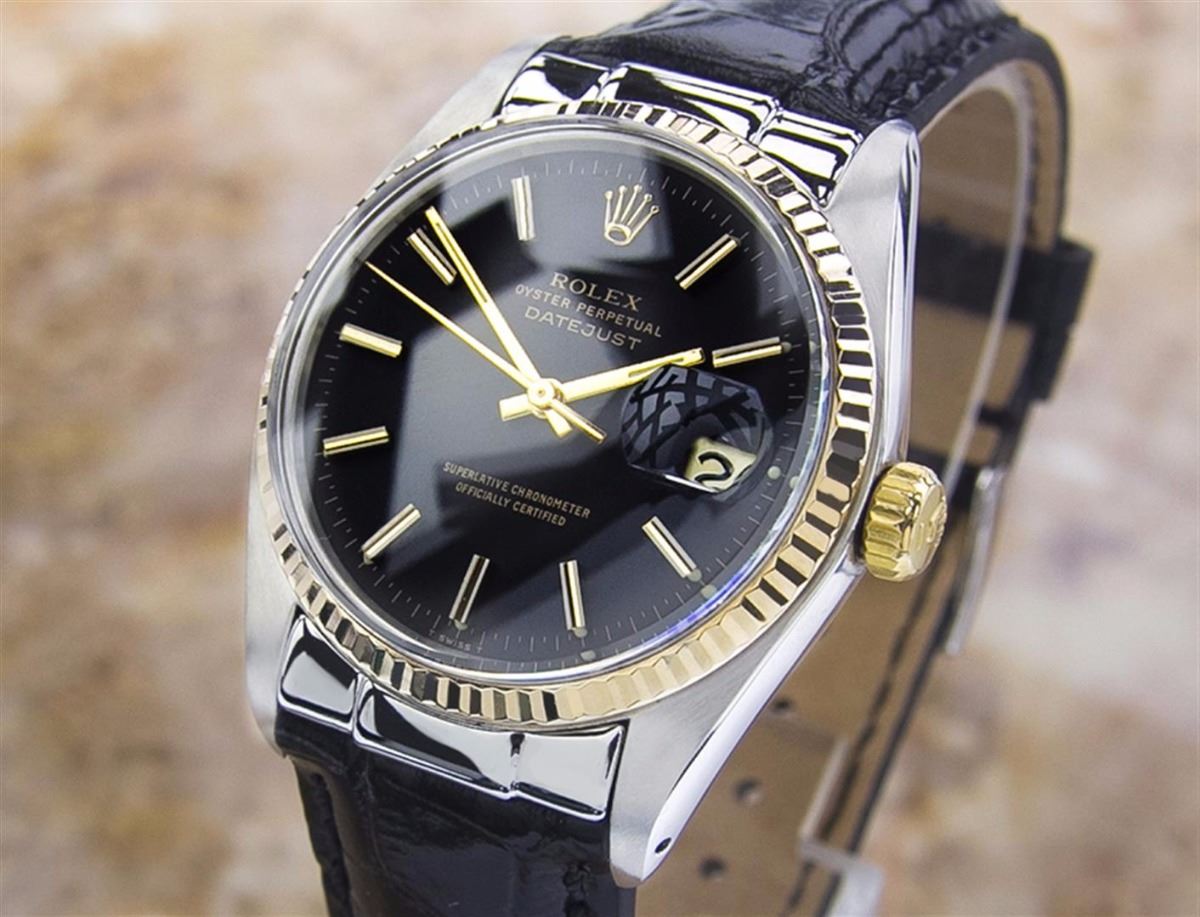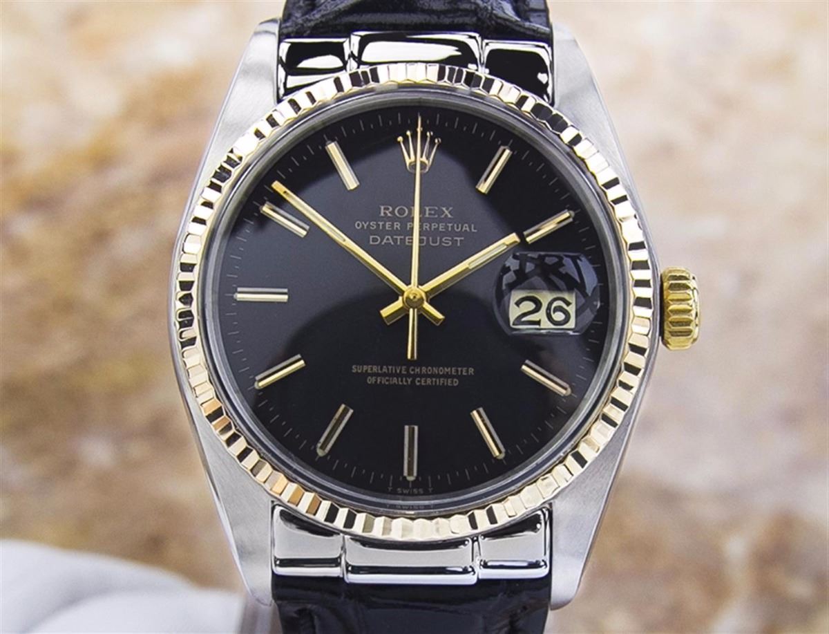 Rolex 1600 DateJust Two-Tone Automatic Watch. Brand: Rolex. Model: 1600 DateJust. Movement: Automatic. Case Material: Stainless Steel & SOLID GOLD. Crystal: ACRYLIC. Case Size: 44X36. Band: NEW LEATHER BAND WITH CUSTOM END LINK.