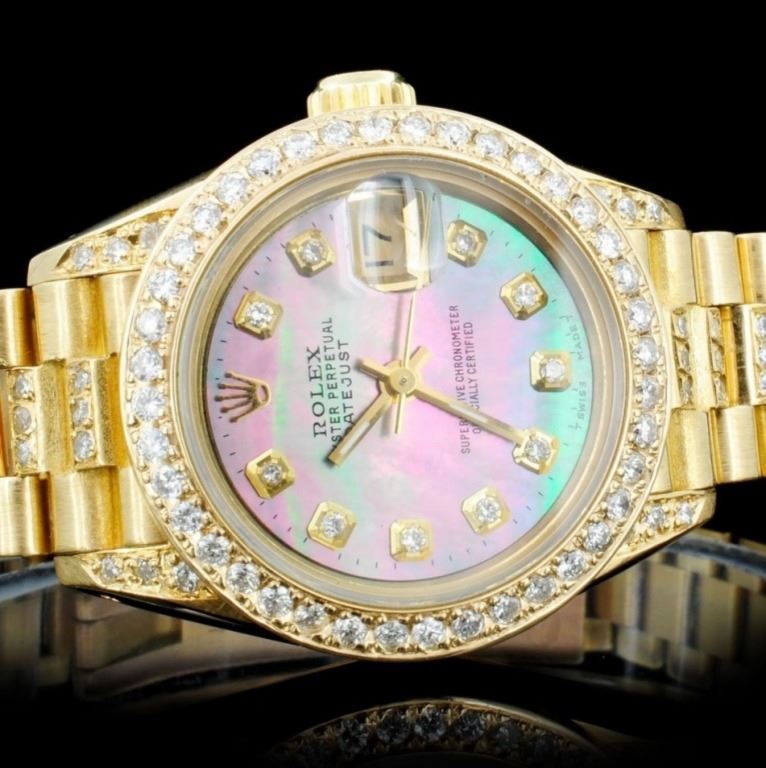 Estimated Retail Replacement Value: $50,000.00Ref: WAG40000Specification:Documents: Gemologist ReportModel: Oyster Perpetual DateJustMovement: Perpetual, Self Winding, 31 - Jewel ChronometerWeight: 73.00 gramsCase Material: 18K Yellow Gold / Set with Custom DiamondBracelet Materials: 18K Yellow Gold / Custom DiamondBracelet Style: Presidential Bracelet / Set with Custom DiamondsBezel Material: 18K Yellow Gold / Custom DiamondsBezel Style: 18K Yellow Gold / Set with Custom DiamondsFunction: Date with Rapid SettingWater-Resistance: Water Resistance 330ft.Crystal: Scratch-resistant sapphire, Cyclops lens (2.5x) over the dateCrown: Rolex Screw-DownDial: Black with play of colors / Mother of Pearl / with custom diamond markersGemstone: Natural DiamondWeight: 3.00ctwShape: Round Brilliant CutClarity Grade: VVS1 - VVS2Color Grade: F