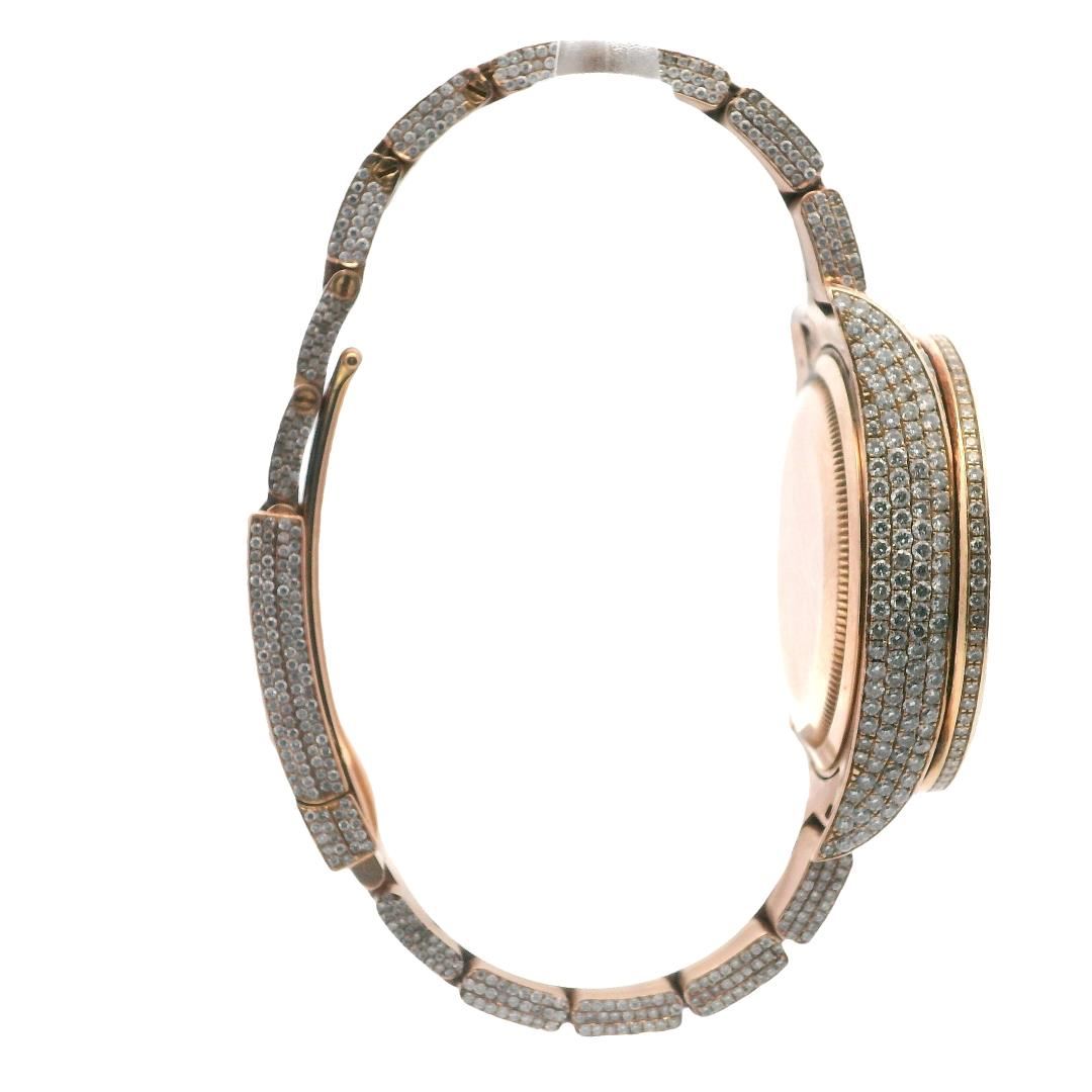 This Rolex Sky-Dweller is crafted from 18K Everose gold and customized with an extravagant 23.80 carats of diamonds. The 42mm case features a custom diamond-encrusted 18K rose gold bezel, framing a rose gold dial with Roman numeral markers. The bracelet is fully set with custom diamonds, complementing the oyster deployment clasp. The timepiece is powered by Rolex's Calibre 9001 movement, ensuring superlative chronometer performance. Diamonds include 42 square-cut channel-set stones totaling 6.00ct, 20 prong-set round brilliant-cut diamonds at 1.20ct, and 2,018 prong-set brilliant-cut diamonds at 16.60ct. A luxury statement with precision engineering
