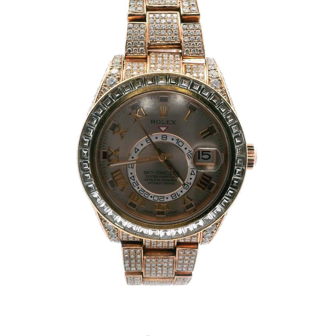 This Rolex Sky-Dweller is crafted from 18K Everose gold and customized with an extravagant 23.80 carats of diamonds. The 42mm case features a custom diamond-encrusted 18K rose gold bezel, framing a rose gold dial with Roman numeral markers. The bracelet is fully set with custom diamonds, complementing the oyster deployment clasp. The timepiece is powered by Rolex's Calibre 9001 movement, ensuring superlative chronometer performance. Diamonds include 42 square-cut channel-set stones totaling 6.00ct, 20 prong-set round brilliant-cut diamonds at 1.20ct, and 2,018 prong-set brilliant-cut diamonds at 16.60ct. A luxury statement with precision engineering