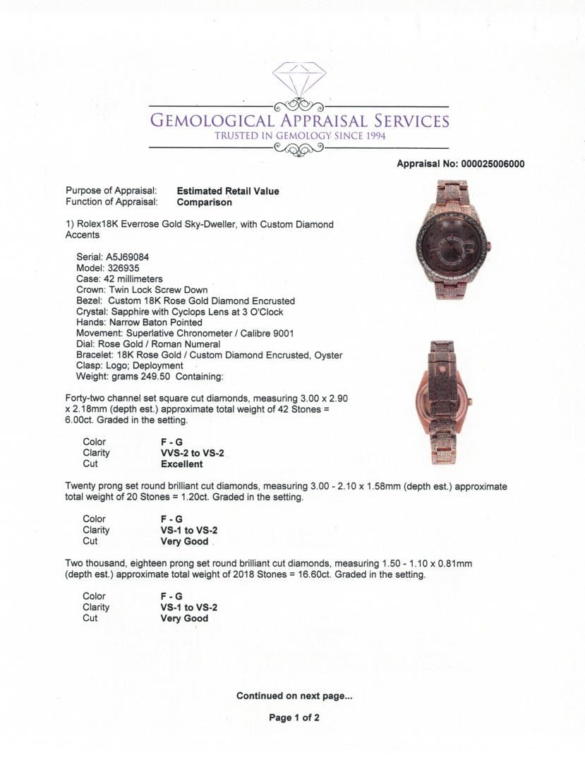 This Rolex Sky-Dweller is crafted from 18K Everose gold and customized with an extravagant 23.80 carats of diamonds. The 42mm case features a custom diamond-encrusted 18K rose gold bezel, framing a rose gold dial with Roman numeral markers. The bracelet is fully set with custom diamonds, complementing the oyster deployment clasp. The timepiece is powered by Rolex's Calibre 9001 movement, ensuring superlative chronometer performance. Diamonds include 42 square-cut channel-set stones totaling 6.00ct, 20 prong-set round brilliant-cut diamonds at 1.20ct, and 2,018 prong-set brilliant-cut diamonds at 16.60ct. A luxury statement with precision engineering