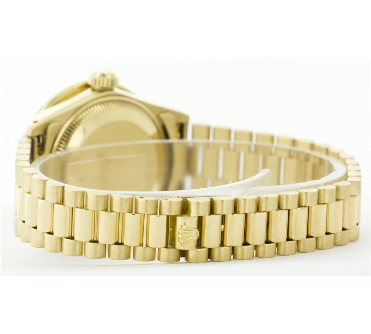 One Ladies 18K Rolex President Polished, Serviced & Electronically Tested, 18K Yellow Gold Case: 26mm, Yellow Gold Crown, Bezel: 18K Yellow Gold 2ctw Channel Set Diamond Bezel, Diamond Count: 32 Diamonds Total Weight 2.00 Carat, Clarity: SI-VS, Color: G to H. Custom Crystal: Sapphire Crystal, Cyclops Lens. Movement: Automatic Winding Movement Caliber 2030. Custom Dial: Mother Of Pearl Diamond Dial, Diamond Count: 10 Diamonds In Dial, Clarity: SI-VS, Color: G to H. Date Window: 3 O'Clock Position, Model: Datejust, Condition: G-6 Extra Fine. Bracelet: 18K Yellow Gold President With Hidden Clasp, Bright & Satin Polish. 5.5 Inch Length, Standard President Clasp (Hidden Clasp), With Rolex Logo.