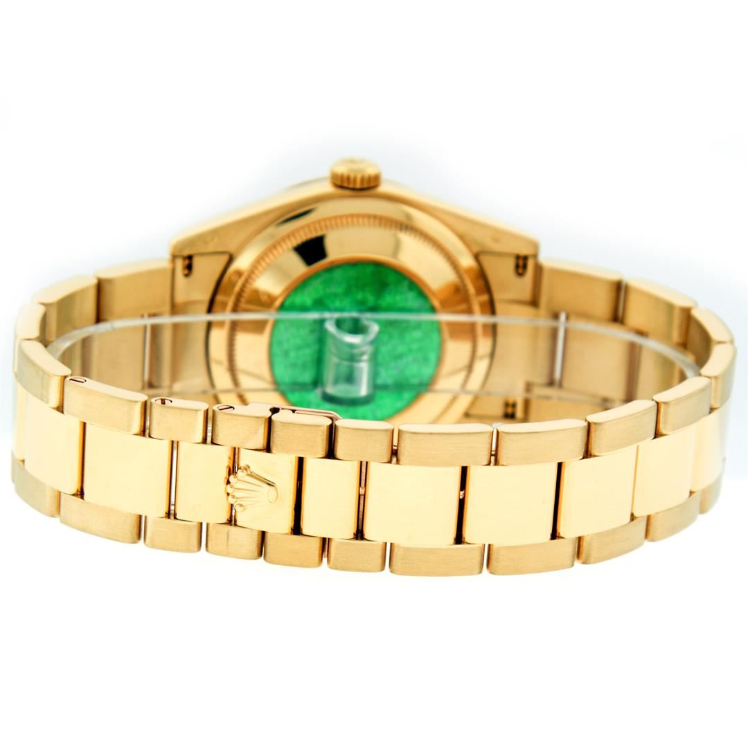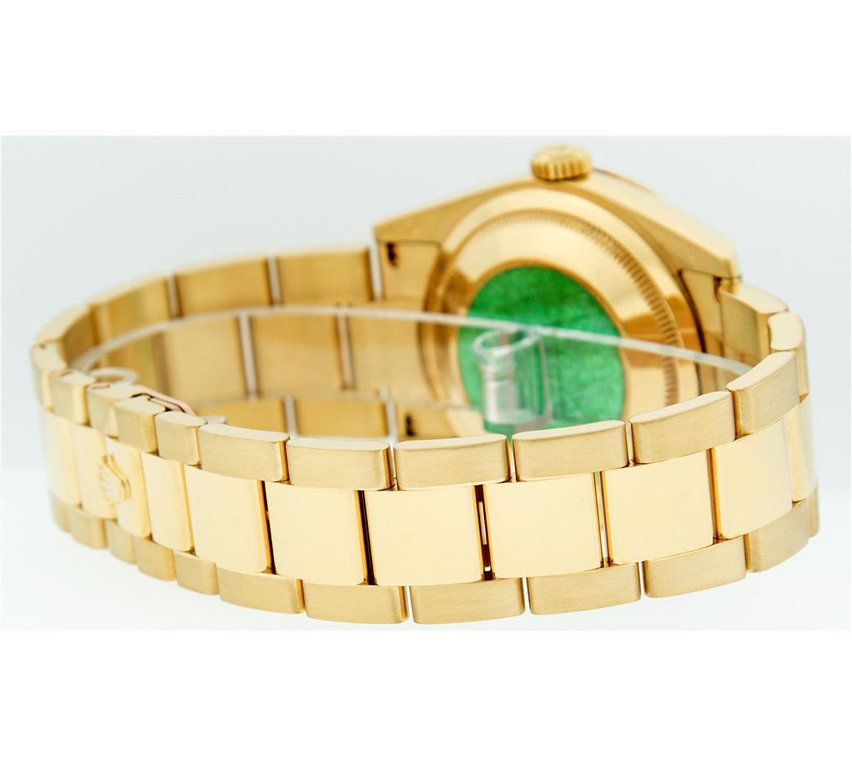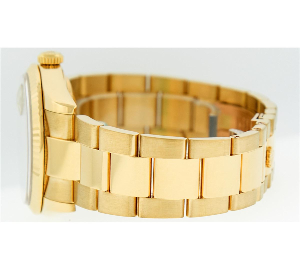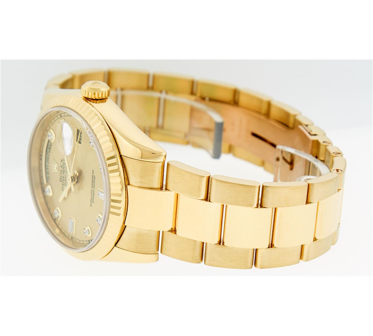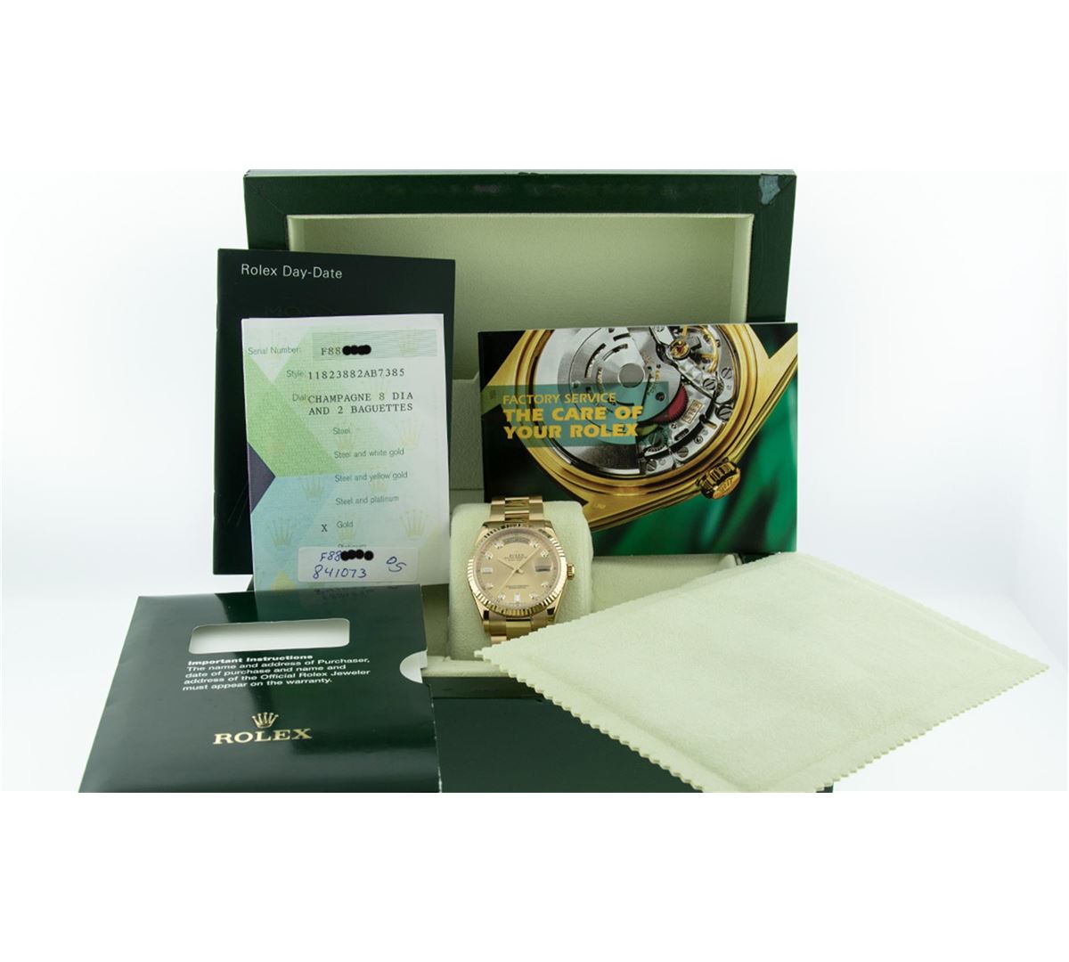 One Mens 18K Yellow Gold Rolex Day Date President Polished, Serviced & Electronically Tested, 18K Yellow Gold Case:36mm, Bezel: 18K Yellow Gold Fluted Bezel. Crystal: Synthetic Sapphire Cyclops Lens. Movement: Automatic Winding Movement Caliber 3155. Dial: Champagne Diamond & Baguette Dial, (8 Diamond + 2 Baguette Diamonds In Dial) E In Color, Clarity: VS. Date Window: 3 O'Clock Position Date Display, Day Display: 12 O'Clock Position. Double Quickset, Model: 118238. Condition: G-6 Extra Fine. Bracelet: Yellow Gold Oyster Band President Band. Bright Polish. 7.0 Inch Length, Standard Oyster Band President Clasp, With Rolex Logo. Comes With Box & Papers. Comes with 6 month warranty.