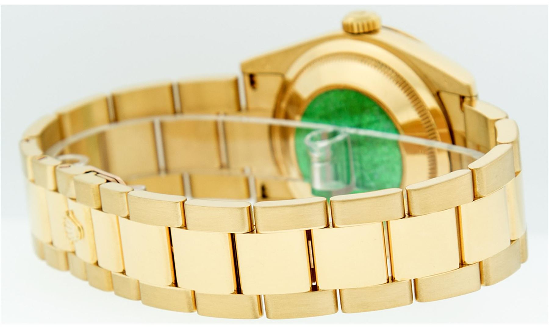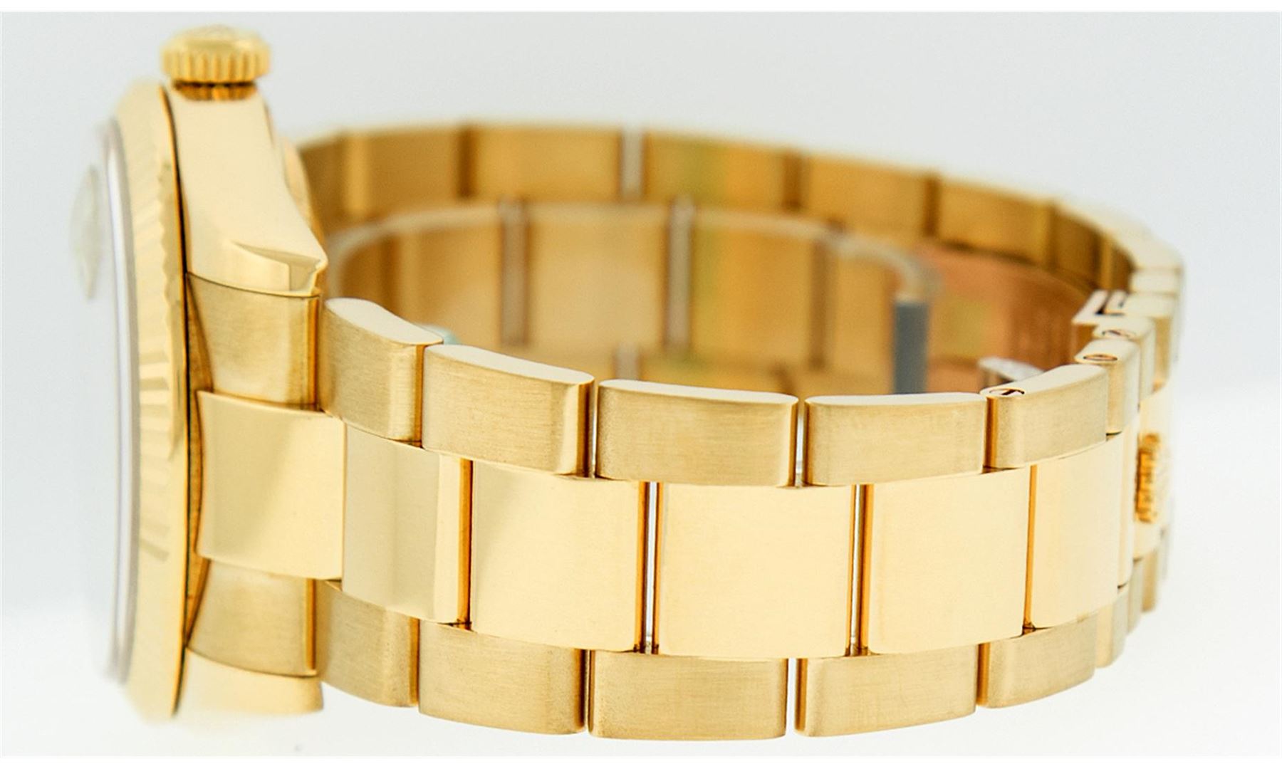 One Mens 18K Yellow Gold Rolex Day Date President Polished, Serviced & Electronically Tested, 18K Yellow Gold Case:36mm, Bezel: 18K Yellow Gold Fluted Bezel. Crystal: Synthetic Sapphire Cyclops Lens. Movement: Automatic Winding Movement Caliber 3155. Dial: Champagne Diamond & Baguette Dial, (8 Diamond + 2 Baguette Diamonds In Dial) E In Color, Clarity: VS. Date Window: 3 O'Clock Position Date Display, Day Display: 12 O'Clock Position. Double Quickset, Model: 118238. Condition: G-6 Extra Fine. Bracelet: Yellow Gold Oyster Band President Band. Bright Polish. 7.0 Inch Length, Standard Oyster Band President Clasp, With Rolex Logo. Comes With Box & Papers. Comes with 6 month warranty.