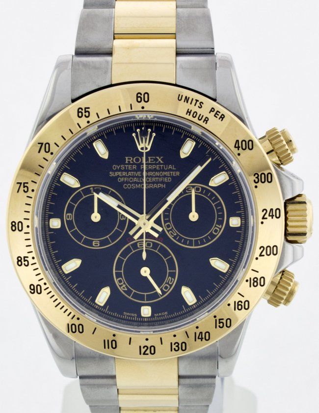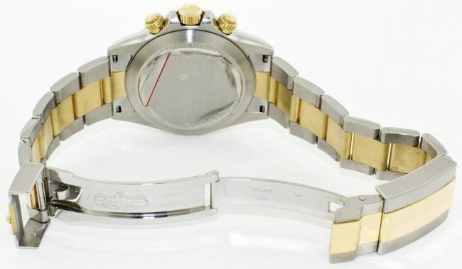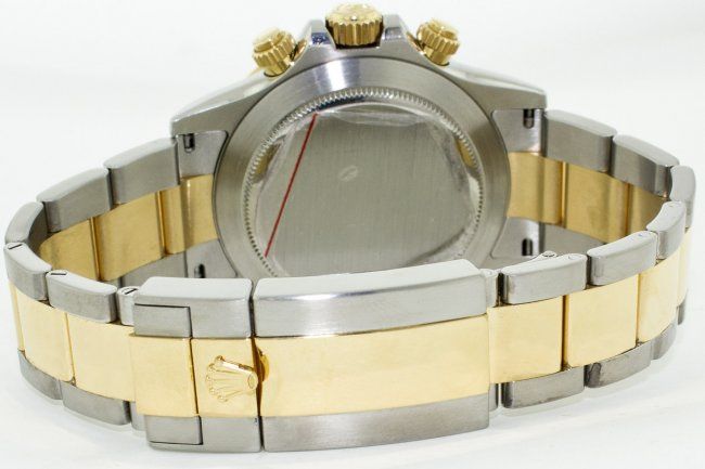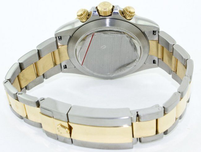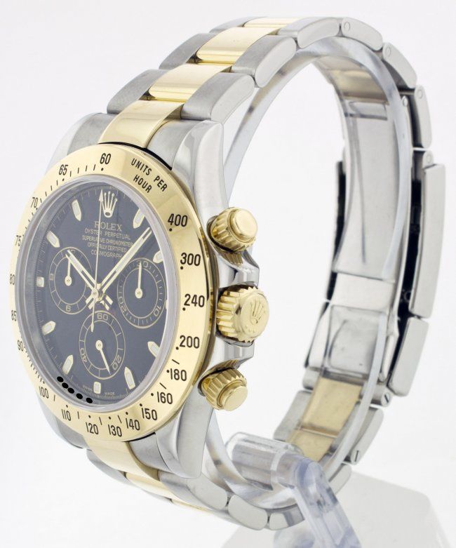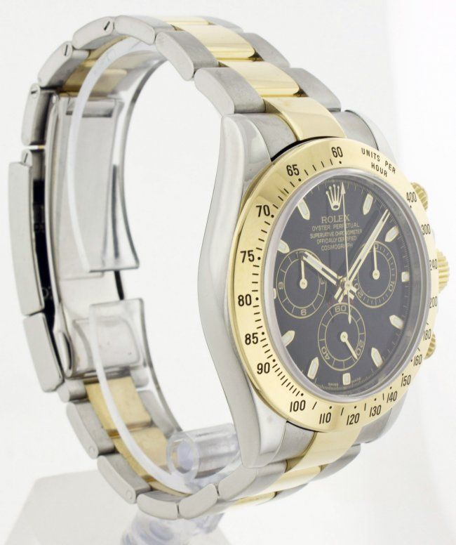 Rolex 18K Yellow Gold and Stainless Steel Daytona 40mm (Late 2000) 116523. Rolex 18K Yellow Gold Bezel. Original Rolex Black Dial set Index Hour Markers. Rolex 18K Yellow Gold and Stainless Steel Oyster with Scratch Resistant Sapphire Crystal. WA37503