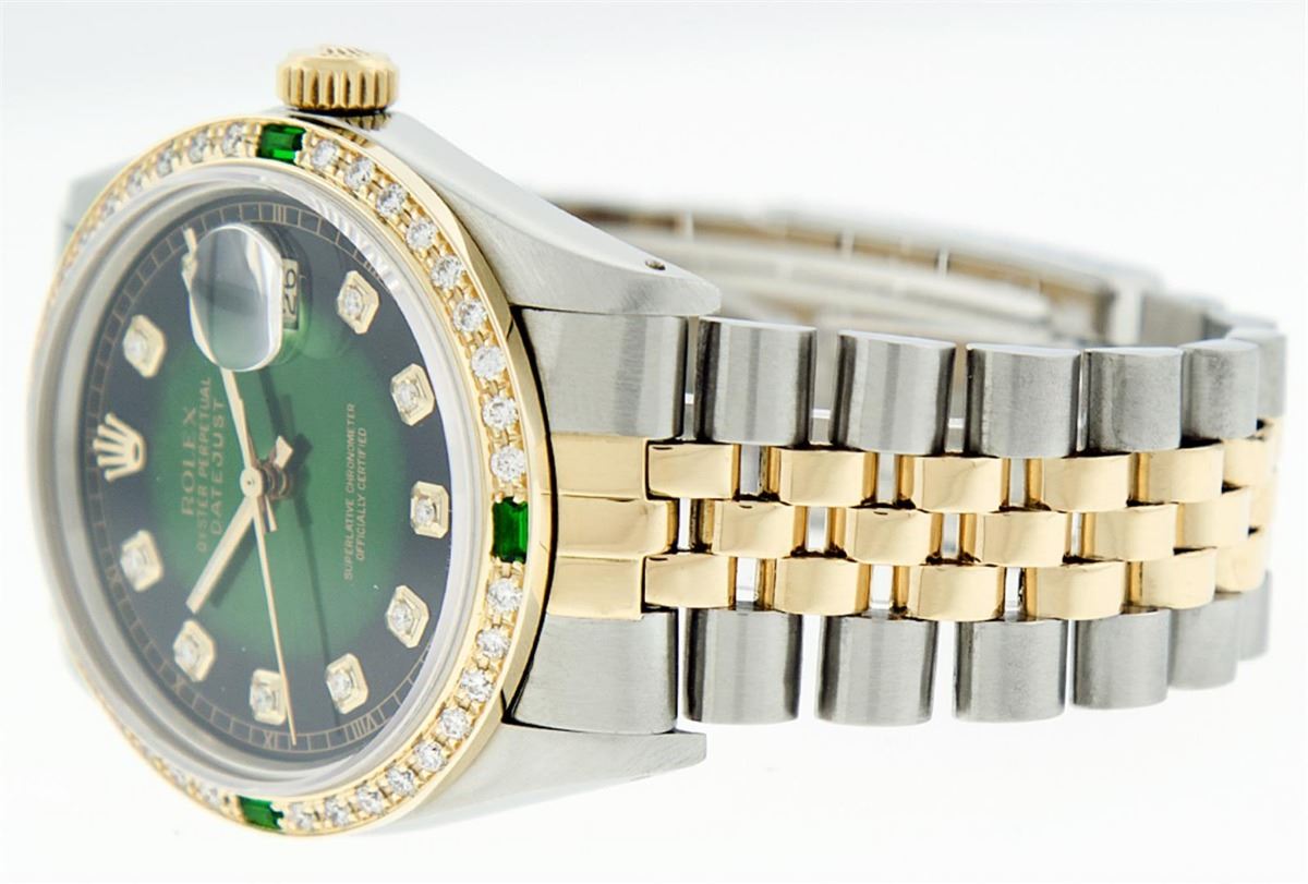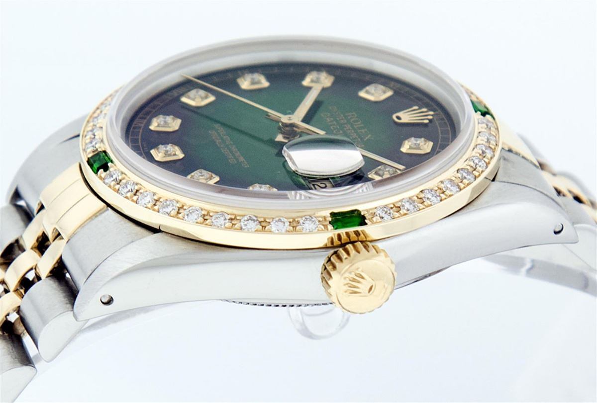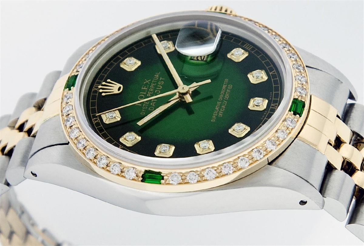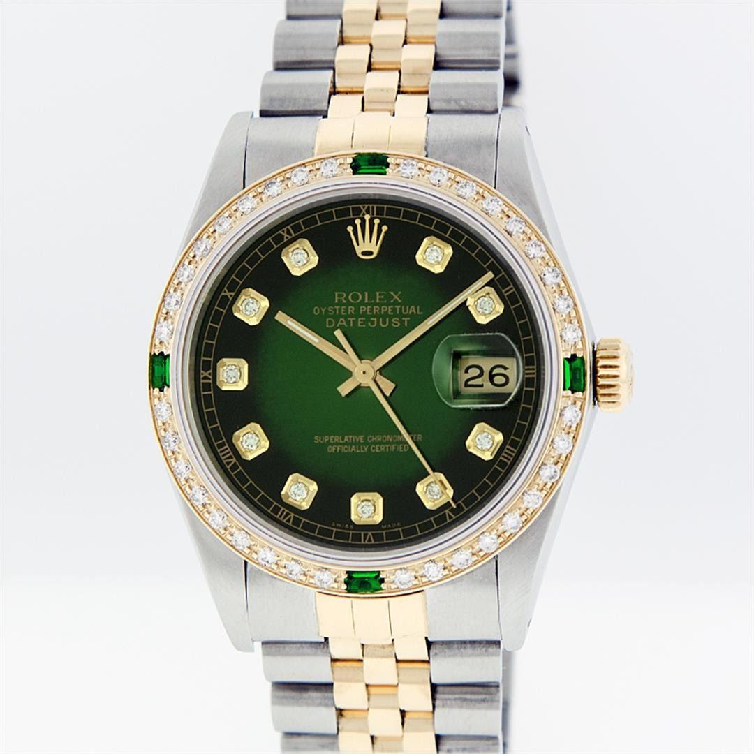 One Gents Two Tone Rolex Datejust Polished, Serviced & Electronically Tested, 18K Yellow Gold & Stainless Steel Case:36mm, 18K Yellow Gold Crown, Custom Bezel: 18K Yellow Gold Emerald Beadset Diamond Bezel, Diamond Count: 36 Diamonds + 4 Emeralds, Total Weight 1.00 Carat, Clarity: Si-VS, Color: G to H. Crystal: Synthetic Sapphire Cyclops Lens. Movement: Automatic Winding Movement Caliber 3135. Custom Dial: Green Vignette With Diamond Hour Markers & Square Roman Track. Diamond Count: 10 Diamonds Clarity: SI-VS, Color: Color G to H Date Window: 3 O'clock Position Date Display, Quickset, Model: 16233 Condition: G-6 Extra Fine. Bracelet: Two Tone 18K Yellow Gold & Stainless Steel Jubilee. Bright Polish. 6.5 Inch Length, Adjustable. Standard Clasp, With Rolex Logo.